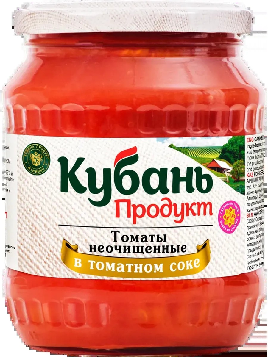 KUBAN PRODUCT tomatoes in tomato juice, unpeeled, have a delicate, juicy texture and a pleasant, well-balanced flavor. They are completely ready to eat and use in cooking. These tomatoes can be served with boiled or fried potatoes. They make a great base for pasta or pizza sauce, complement meat and vegetable stews, and are a perfect accompaniment to fish dishes.
