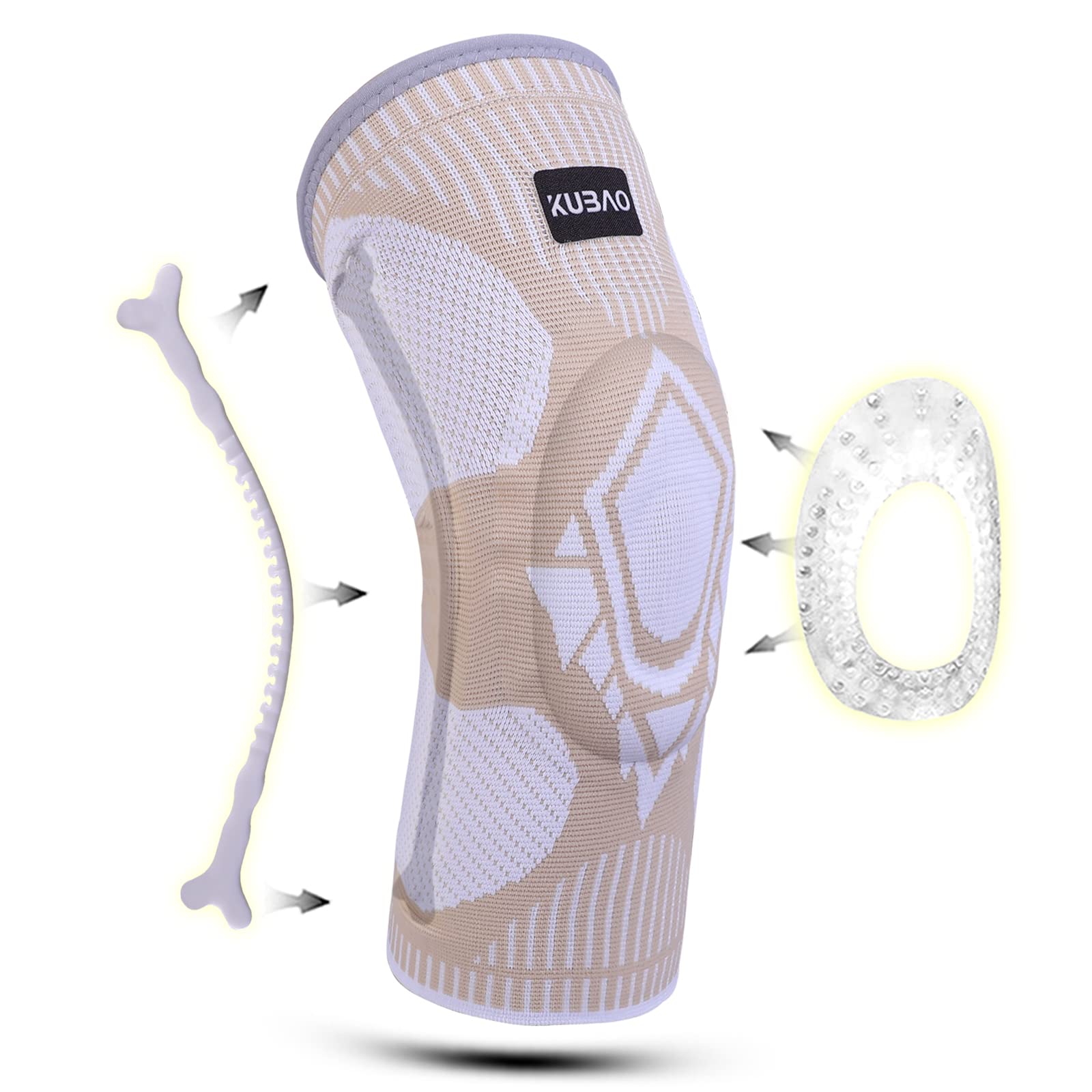 ?Anti-slip design?:The top of the KUBAO knee pads is designed with anti-slip silicone waves, which is to ensure that the knee pads will not slip or slide during exercise. Silicone waves provide excellent slip resistance and can accommodate knees of all sizes and shapes. ?Innovative design?:Upgrade designed knee pads use the best compression technology to achieve full protection. Cushioning and decompression, disperse knee pressure, improve blood circulation,and protect knees from injury. Too tight will restrict movement and blood flow. Too loose, you will lose the compression benefits. During workouts or activities, knee sleeves will always stay in right place to provide excellent support without compromising your mobility. ?Premium Material?:Our knee braces for knee pain are lightweight and durable, Made from a blend of nylon and latex, unique breathable mesh design, increases breathability. soft and delicate, perfectly fitting your skin, absorbing sweat, and making you feel clean and comfortable. It can be washed well without shrinking or losing compression. ?Bilateral Support?:The bilateral support design of KUBAO knee pads has two springs, which can provide long-lasting support and relieve knee pain. These spring support rods are highly elastic and can automatically expand and contract according to the bending angle of the knee. This design not only reduces the pressure on the knee, but also provides stability to the knee, preventing the knee from twisting or shifting during movement. ?Ergonomic design?:KUBAO Knee Pads Are Ergonomically Designed Rubber Pads To Ensure The Comfort And Stability Of The Knee. The Patella Was Sutured With Silicone Gasket. This Material Is Soft, Elastic, Shockproof And Decompression, Which Can Reduce The Damage Of Patella. If The Knee Pad Does Not Have Good Support And Cushioning Effect, It Is Easy To Cause Knee Pain Or Other Injuries. It Is Better To Wear Yoga Pants And Knee Pads. ?64% Nylon+1% Polyester+14% Spendex+21%latex.