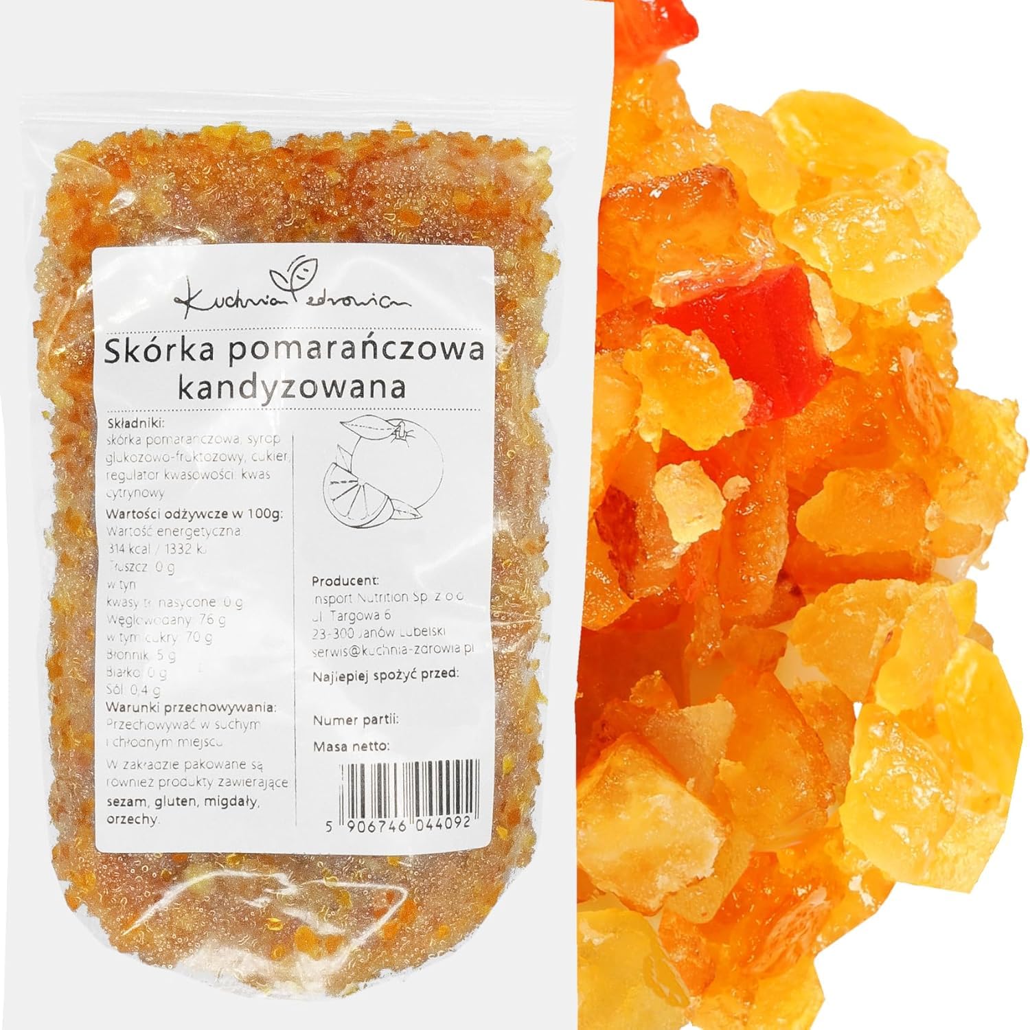 Our products are packaged in-house according to the strictest quality and food safety standards (HACCP). All products are packaged in sturdy doypacks with a drawstring closure, allowing the packaging to be opened and resealed multiple times. This ensures that once opened, the product retains its freshness for as long as possible. The products we offer are of the highest quality and only premium quality. Therefore, we use transparent packaging so you can clearly see the product before purchg and opening it. All photos shown are our own and represent the actual products we offer for sale. Each product is labeled with information on the expiration date, nutritional values, and country of origin. INGREDIENTS Orange peel, glucose-fructose syrup, sugar, acidity regulator: citric acid. INSTRUCTIONS FOR USE Storage conditions: Store in a dry, well-ventilated place. Best before: The expiration date is indicated on the packaging label. SAFETY WARNING Also packaged at the factory: sesame, almonds, products containing gluten, various nuts. Despite all precautions taken, the presence of these raw materials in the product cannot be completely ruled out. See moreCubes d'écorces d'orange confites - Sans conservateurs - Sans additifs inutiles - Kuchnia Zdrowia - Emballage étanche avec zip - Doypack : (500g)DESCRIPTION DU PRODUIT DESCRIPTION DU PRODUIT Nos produits sont conditionnés en interne selon les normes de qualité et de sécurité alimentaire les plus strictes (HACCP). Tous les produits sont emballés dans des doypacks robustes, munis d'une ficelle permettant d'ouvrir et de fermer l'emballage plusieurs fois, de sorte qu'une fois ouvert, le produit conserve sa fraîcheur le plus longtemps possible. Les produits que nous proposons sont de la plus haute qualité et uniquement de la première qualité, c'est pourquoi nous voulons que l'emballage transparent vous permette de voir clairement le produit avant de l'acheter et de l'ouvrir. Toutes les photos présentées sont de notre auteur et représentent les produits réels que nous proposons à la vente. Chaque produit est étiqueté avec des informations sur la date de péremption, les valeurs nutritionnelles et le pays d'origine. INGRÉDIENTS écorces d'orange, sirop de glucose-fructose, sucre, correcteur d'acidité : acide citrique. MODE D'EMPLOI Conditions de conservation : Conserver dans un endroit sec et bien ventilé. À consommer de préférence avant le : La date de péremption est indiquée sur l'étiquette de l'emballage. AVERTISSEMENT DE SÉCURITÉ Également conditionnés en usine : sésame, amandes, produits contenant du gluten, divers fruits à coque. Malgré toutes les précautions prises, la présence de ces matières premières dans le produit ne peut être exclue à 100 . Voir plus