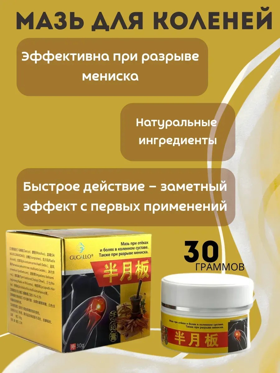 Мазь для коленей - эффективное средство при боли в коленном суставе, отёках и воспалении. Она особенно полезна при разрыве мениска, а также при артрите, артрозе и спортивных травмах. Натуральный состав на основе традиционной китайской медицины способствует улучшению кровообращения, снижению боли и ускоренному восстановлению тканей. Эта мазь для суставов подходит как для активных людей, так и для пожилых, страдающих от хронической боли. Средство быстро впитывается, не оставляя жирных следов, и уже после первых применений помогает почувствовать облегчение. Если вам нужно натуральное, согревающее и действенное средство от боли в коленях — эта мазь станет отличным решением. Подходит для использования при любых проблемах с коленными суставами, включая отёки, воспаления и травмы мениска.