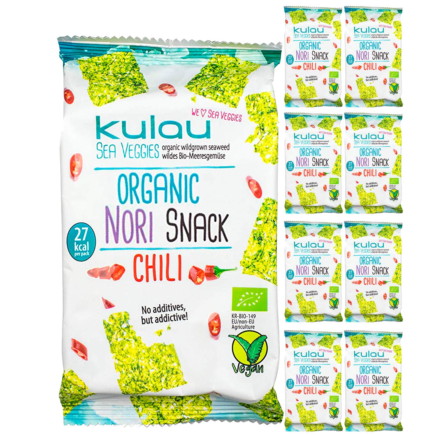 De Kulau crispy Seaweed Snack is een echt genot en een nieuwe smaakbeleving voor de Europese smaakgehemelte. Gedroogde Nori-algenbladeren, verfijnd met biologische zonnebloemolie en natuurlijk zeezout en chili, ronden het lekkere, Aziatische chipsalternatief af. De fijne en knapperige bladeren op de tong breken zeer zacht en zorgen voor een milde chili-smaak - een plezier voor je smaakpap!