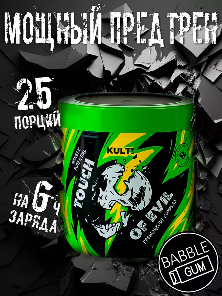 Предтренировочный комплекс – многокомпонентная добавка, разработанная специально для спортсменов, которые хотят усовершенствовать результат тренировок. В составе Touch of Evil собраны энергетические стимуляторы, аминокислоты, донаторы азоты и прочие вещества, помогающие организму быстрее подготовиться к интенсивным физическим нагрузкам. Их действие комплексное: улучшение кровообращения и снабжения мышечных волокон кислородом; повышение сосредоточенности и концентрации на выполняемых действиях; стимуляция метаболических процессов;пампинг; снижение усталости даже при изнурительном тренировочном процессе. Предтренировочный комплекс при условии соблюдения дозировки не оказывает на организм негативного влияния и не вызывает привыкания. Предтреник Touch of Evil со вкусом бабл-гам от Kultlab – открытие в мире спортивного питания. Добавка рекомендована любителям и профессиональным спортсменам, которые хотят оставить соперников далеко позади. Энергетический комплекс от КультЛаб содержит 10 компонентов, сбалансированных между собой: Таурин, Цитруллин, Аргинин, ААКГ, Карнозин, 5-НТР, Агматин, экстракты герани и зеленого чая, кофеин. Предтрен предназначен для повышения выносливости, усиления энергетического обеспечения мышц при интенсивных нагрузках, убирает сонливость. Универсальный комплекс взбодрит и придаст энергии для продолжительной тренировки. Силовые показатели, выносливость и концентрация поднимутся до непривычных высот. Таурин, выступающий в качестве нейромедиаторной аминокислоты, обеспечит питание клеток энергией и усилит действие всех компонентов комплекса. Цитруллин - донатор оксида азота, улучшит кровоток в мышцах, снизит утомление и увеличит пампинг эффект. Аргинин обеспечит лучшую доставку кислорода и питательных веществ к мышцам во время тренировок. AAKG (Аргинин-альфа-кетоглутарат, Aakg) увеличит мышечную массу и силу. Ни один высококалорийный, высокобелковый и высокоуглеводный протеиновый power батончик, как и пп печенье с шоколадом и ванилью, углеводный, протеиновый гейнер обогащение протеином, белком и углеводами, не дадут столь выраженный результат. Каждая сверхконцентрированная доза БАД содержит в себе ошеломляющий коктейль ингредиентов, которые вознесут вашу силу, выносливость, ментальный фокус на небывалую высоту и нереальный памп мышц. Спортпит Touch of Evil от культ лаб быстро растворяется в воде и обладает приятными неприторным вкусом. Его принимают за 30 минут до тренировки, чтобы эффективно провести время в зале. Начинать прием следует с 1/2 порции для определения толерантности к продукту. Предтренировочный коктейль - незаменимый помощник в подготовке к важным соревнованиям, гарантирует оптимальную сосредоточенность на процессе выполнения упражнений. Результат будет ошеломляющим! Предтрен Тач оф эвил культлаб является идеальным подарком для спортсменов, бодибилдеров, мужчин и парней, занимающихся спортом и стремящихся к мощным результатам.