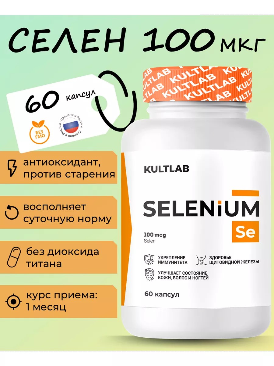 Selenium от Kultlab - это мощный антиоксидант для поддержания красоты, здоровья и иммунитета. БАД Селен от Культлаб содержит 100 мкг микроэлемента, что обеспечивает его суточную потребность в организме. Ежедневный прием витамина помогает улучшить иммунитет, состояние кожи, волос и ногтей, способствует нормализации работы сердечно-сосудистой системы и увеличивает работоспособность организма в целом. Селен витамины необходим для работы щитовидной железы, помогая сбалансировать гормоны и защищая от вредных свободных радикалов. Селен также важен для мышечного тонуса, снижения утомляемости и ускорения обмена веществ. Добавка оказывает положительное влияние на репродуктивное здоровье; обладает Anti Age эффектом; защищает кожу от морщин и преждевременного старения;, препятствует выпадению волос, уменьшает ломкость ногтей и увеличивает толщину ногтевой пластины; обладает противовоспалительными, иммуномодулирующими свойствами; защищает сердечно-сосудистую систему от токсического действия лекарств и тяжелых металлов. Se - онкопротектор, он стимулирует противоопухолевый иммунитет, в том числе применяется против рака простаты у мужчин. Принимайте селен в комплексе с цинком (арт. 183846387), витамином Д3 (арт. 50407124), йодом (арт. 200282977) и эффективность положительных свойств мультивитамина восзрастет. БАД не содержит диоксид титана, химических красителей, ГМО, сою, глютен. Принимайте витамин от Kultlab для профилактики, подарите здоровье своим близким на Новый год, день рождения, 23 февраля, 8 марта или без повода. Подойдет мужчинам и женщинам, незаменимо для спортсменов, пожилых людей. Рекомендуем попробовать другие витаминные комплексы нашего бренда.