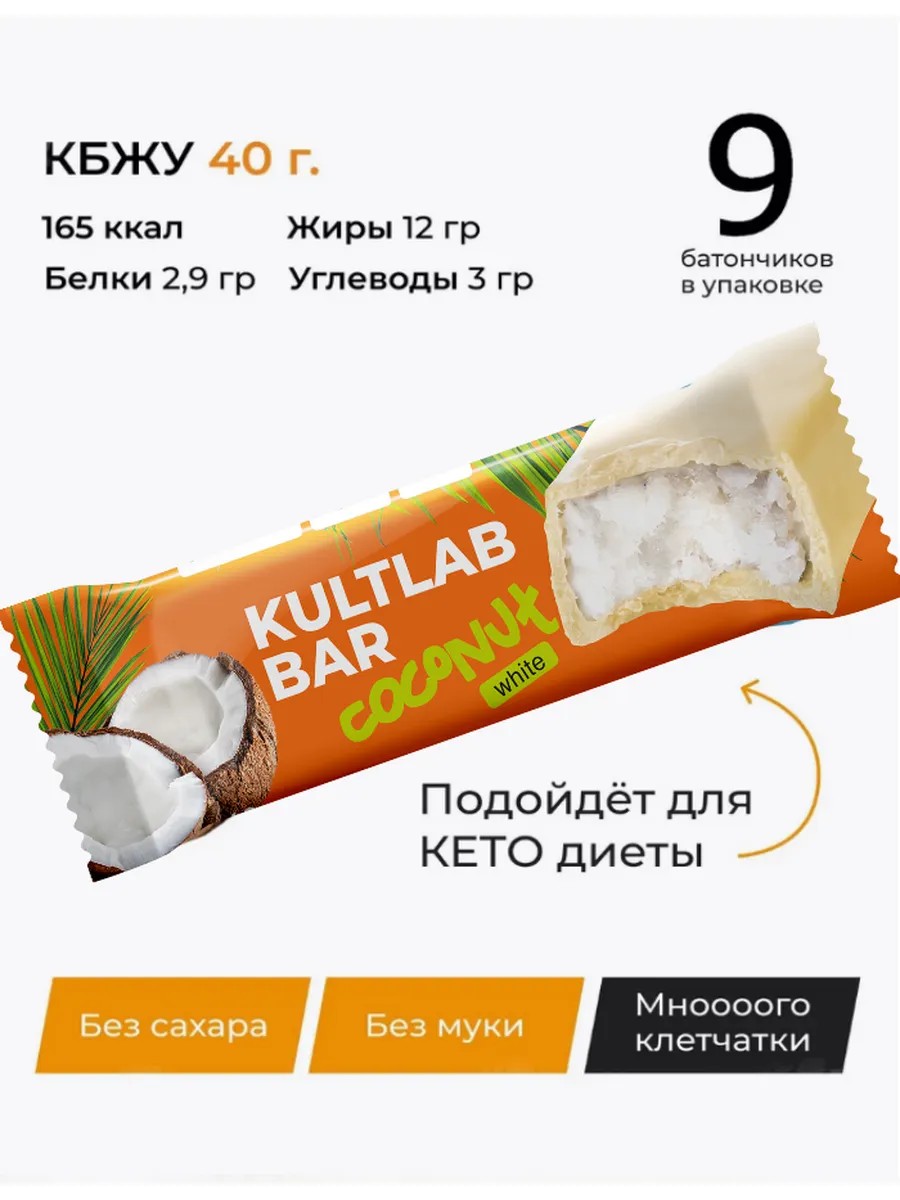 Представляем вам вкусный и полезный способ побаловать себя - шоколадные батончики coco nut от KultLab в белом шоколаде! Эти батончики с восхитительным вкусом кокоса и молочного шоколада станут идеальным перекусом для тех, кто следит за своим здоровьем и фигурой. Благодаря отсутствию сахара, они подходят для диабетиков и тех, кто придерживается кето-диеты, не повышая уровень инсулина. В каждом батончике вы найдете ценный кокос и клетчатку, которые обеспечат вас энергией и помогут контролировать аппетит. KultLab coconut - это не просто вкусняшка, это забота о себе! В упаковке 9 батончиков, что позволит вам наслаждаться этим лакомством в течение долгого времени. Очень удобно брать с собой в качестве перекуса во время прогулок, учебы работы! Побалуй себя свежим, сочным, кокосовым батончиком ;)