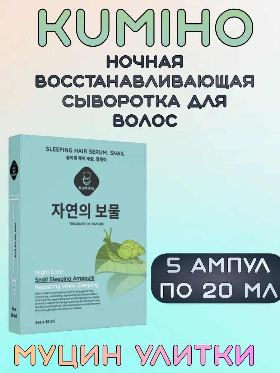 Ночная восстанавливающая сыворотка для волос муцин улитки в 5 ампулах от Kumiho - это интенсивная несмываемая сыворотка для поврежденных волос, оказывает питательное, увлажняющее, восстанавливающее и защитное действия. Муцин улитки в составе ампулы обладает регенерирующим свойством, благодаря которому восстанавливает повреждения от сушки, завивки и ежедневного расчесывания волос. Эффективно увлажняет и сглаживает кутикулу, придавая волосам блеск и сияние. Выполняет роль естественного защитного слоя для локонов, смягчая и защищая их от внешних вредных факторов. Волосы становятся более сильными, шелковистыми, плотными и блестящими. Для одного применения достаточно всего одной ампулы. Сыворотка Кумихо универсальна, поэтому можно ее использовать в качестве дневного ухода. Это незаменимый помошник для ваших волос.