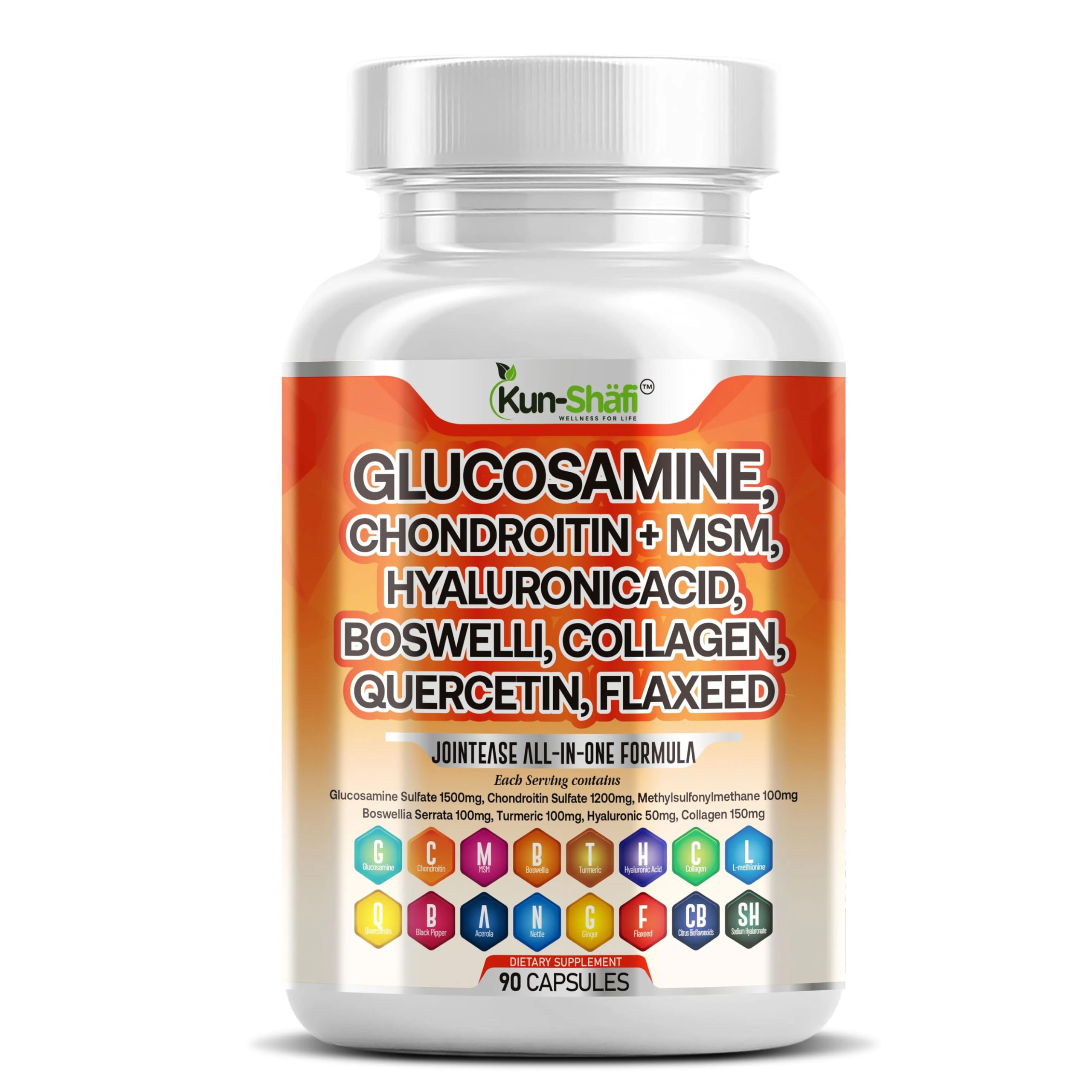 Kun Shafi JointEase – All-in-One Joint Support Complex – Designed for men and women who want a daily joint care solution with Glucosamine Sulfate 1600mg, Chondroitin, MSM, Collagen, Turmeric, and Hyaluronic Acid. Supports ease of movement, joint flexibility, and everyday comfort in an easy-to-take capsule—no messy powders or bulky stacks needed. Daily Joint Bone Support with Omega Nutrients and Essential Vitamins – Packed with Calcium, Vitamin C, and Black Pepper Extract to support absorption, Kun Shafi JointEase helps nourish joints, bones, and connective tissue. A smart alternative to fish oils, collagen liquids, or multivitamin stacks—perfect for men and women seeking a simple all-in-one joint wellness formula. Complete Mobility Blend with MSM, Boswellia, Quercetin More – Formulated to support active joints, Kun Shafi JointEase features MSM, Boswellia Serrata, and Quercetin to help ease stiffness and promote daily comfort. A convenient, capsule-based option for those seeking full-spectrum joint support without powders, mixing, or patches. Advanced Hip Knee Support with Collagen, Turmeric, and Hyaluronic Acid – Kun Shafi JointEase combines key nutrients like Collagen Type II, Turmeric Extract, and Hyaluronic Acid to promote joint cushioning, flexibility, and smooth movement. Perfect for adults looking to maintain joint comfort and hydration in the hips and knees—without the mess of topical creams or chewable gummies. Kun Shafi Glucosamine Chondroitin MSM Joint Support Supplement – JointEase delivers Glucosamine Sulfate 1600mg, Chondroitin, and MSM to help support joint structure, flexibility, and mobility. Enhanced with Boswellia, Collagen, Turmeric, and Hyaluronic Acid, this once-daily capsule-based formula is a clean alternative to joint gummies, powders, and liquid glucosamine.