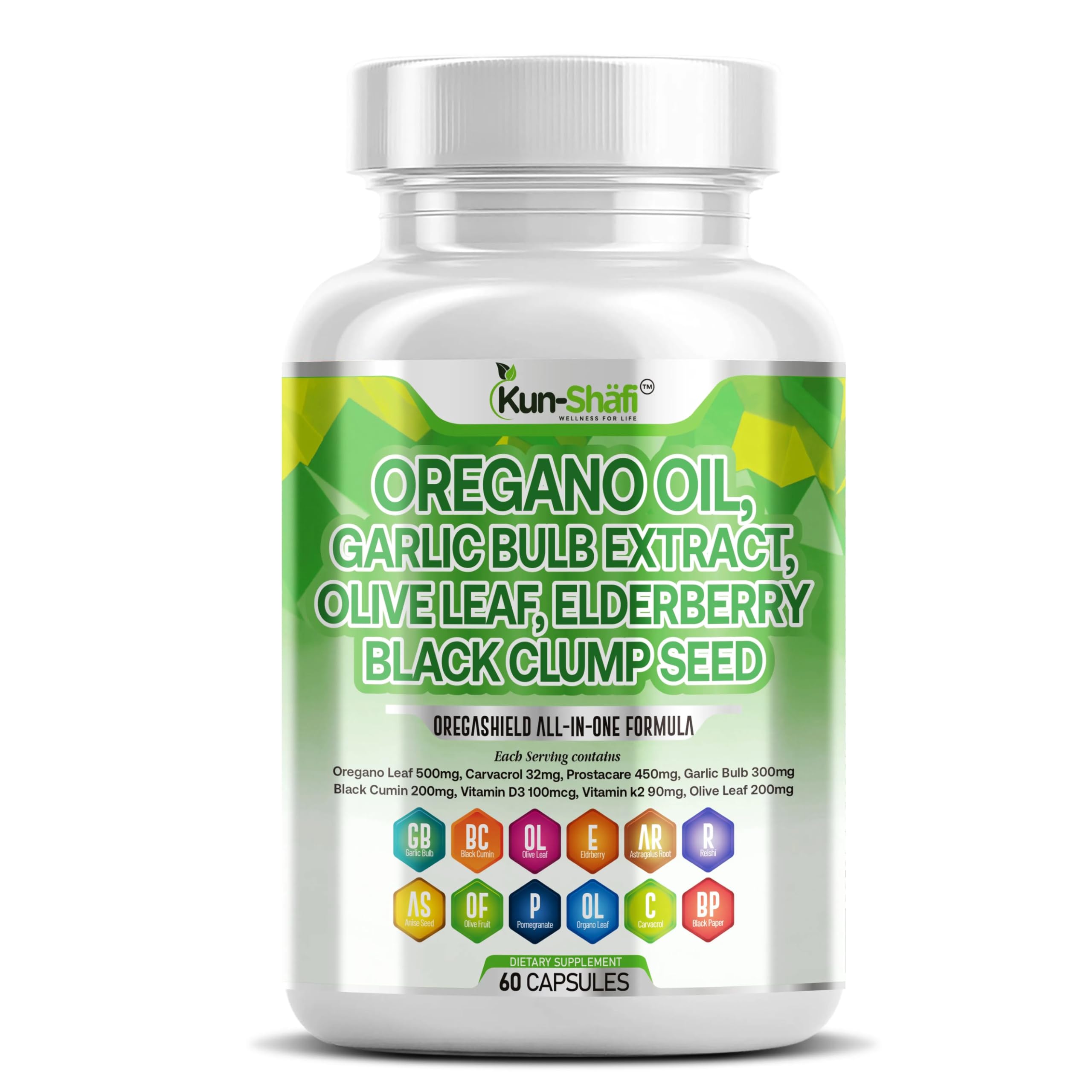 Kun Shafi All-in-One Immune Support Supplement is a premium herbal formula designed to help support your immune system, digestive health, and overall wellness. Powered by our unique OLIGAPLEX blend, each capsule delivers a potent combination of Oregano Oil, Garlic Extract, Black Seed Oil, Olive Leaf, Elderberry, Zinc, and Vitamin D3—all known for their traditional and science-backed health benefits. Formulated for both men and women, this supplement supports year-round immunity, promotes respiratory and gut health, and provides essential nutrients to keep you feeling your best every day. We've also included Black Pepper Extract to enhance nutrient absorption. Manufactured in a GMP-certified facility, Kun Shafi supplements are made with carefully sourced ingredients and undergo strict quality control to ensure safety, purity, and effectiveness. Our easy-to-swallow capsules are free from GMOs, artificial additives, and unnecessary fillers.Trusted Ingredients, Thoughtfully Formulated – At Kun Shafi, we combine the benefits of zinc, oregano oil, odorless garlic, black seed oil, and more in one powerful daily supplement. Manufactured in a certified facility, our formula offers more than just a few herbs—it's a complete wellness solution crafted for quality and performance. A Powerful Herbal Complex with Oregano and Olive Leaf – Kun Shafi's advanced formula features zinc gluconate, vitamin D3, oregano oil, olive leaf, and black seed oil in one inclusive supplement. Say goodbye to multiple bottles of zinc tablets, oregano oil drops, and black seed oil liquid—this is your all-in-one solution for daily immune and wellness support. Introducing Kun Shafi's All-in-One Oregano Oil and Herbal Support Supplement – This advanced formula includes zinc gluconate, vitamin D3, odorless garlic, olive leaf extract, oregano oil powder, and black seed oil—all combined to support immune and digestive health. A smart herbal alternative to traditional black seed oil drops, oregano oil liquids, and other single-ingredient capsules. The Complete Olive Leaf and Oregano Oil Complex You've Been Waiting For – Kun Shafi's OLIGAPLEX formula delivers a powerful blend of zinc, vitamin D3 , black seed oil, elderberry, garlic extract, and olive leaf—all combined in just two easy capsules per day. Experience convenient, full-spectrum immune and digestive support in one trusted supplement. Advanced Oregano and Garlic Supplement for Men and Women – Kun Shafi brings together oil of oregano powder and garlic extract with a powerful fusion of olive leaf, elderberry, and black seed oil. This all-in-one herbal formula is thoughtfully crafted to support immune defense and digestive wellness in one convenient daily supplement.