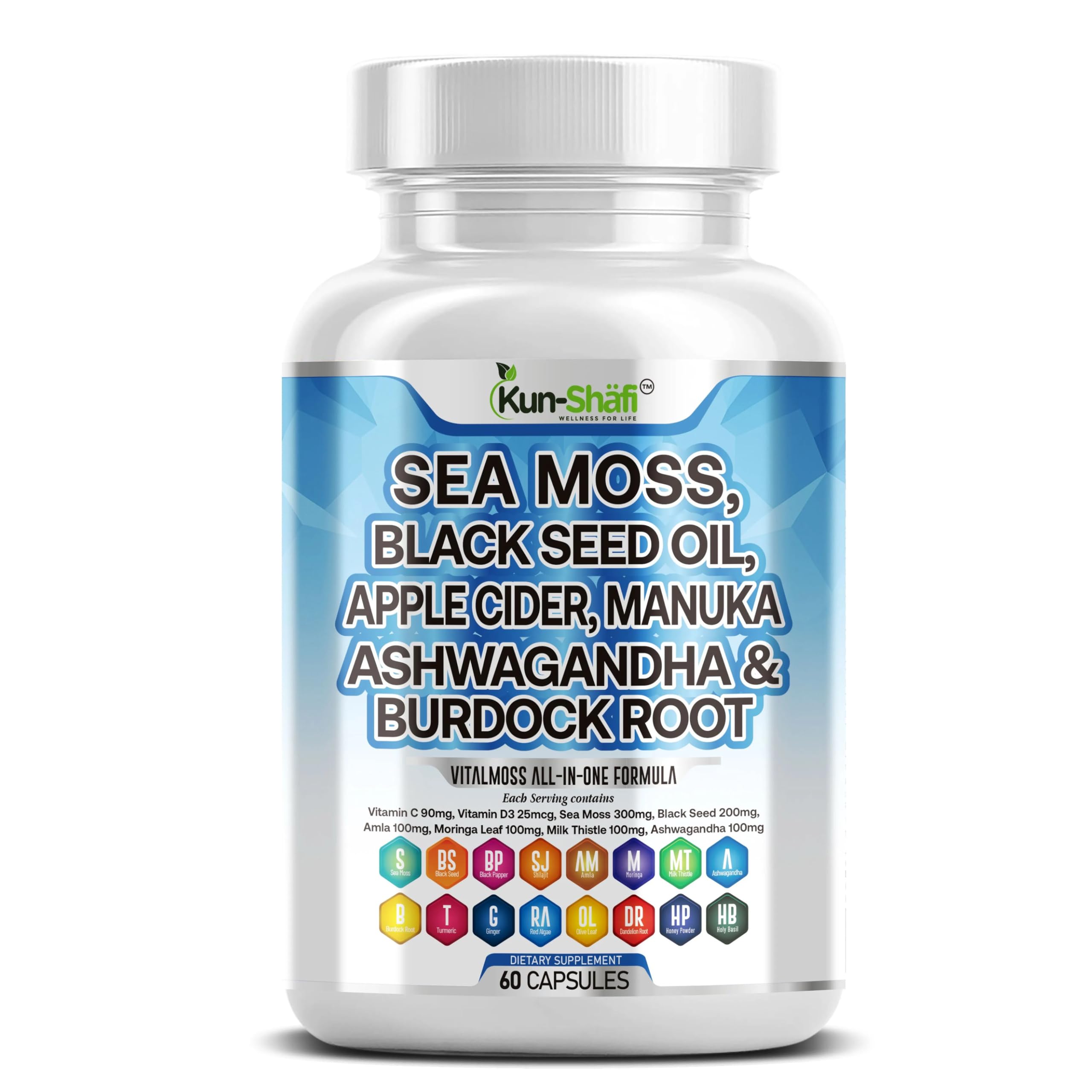 Vetted and Trusted Ingredients – At Kun Shafi, we pride ourselves on using carefully selected herbs and nutrients, including Sea Moss, Black Seed Oil, Shilajit, Ashwagandha, Amla, Burdock Root, and Moringa. Our VitalMoss Complex combines these traditional botanicals with added support from Turmeric, Milk Thistle, Ginger, Vitamin C, Vitamin D3, Chlorophyll, Manuka Honey, and Holy Basil. Each capsule is crafted with clean, high-quality ingredients to deliver a trusted sea moss and herbal blend you can rely on every day. A Powerful All-In-One Supplement – Kun Shafi's VitalMoss Complex is packed with Sea Moss, Black Seed Oil, Shilajit, Ashwagandha, Burdock Root, Moringa, and Turmeric in one convenient formula. Instead of keeping countless single-ingredient supplements, simplify your routine with our 15-in-1 blend that includes Amla, Milk Thistle, Ginger, Vitamin C, Vitamin D3, Chlorophyll, Manuka Honey, Holy Basil, and more. We made sea moss capsules even better by combining them with Black Seed Oil, Shilajit, and our exclusive VitalMoss Herbal Blend for a complete wellness solution. Introducing the VitalMoss Herbal Blend – Sea Moss Capsules, Black Seed Oil, Shilajit, Ashwagandha, Amla, and Burdock Root combined with 15 powerhouse ingredients including Turmeric Curcumin, Moringa, Milk Thistle, Ginger, Vitamin C, Vitamin D3, Chlorophyll, Manuka Honey, and more! These sea moss burdock and black seed capsules offer a convenient alternative to sea moss gummies, black seed oil gummies, or ashwagandha powders for men and women. Not just raw organic sea moss or wildcrafted gel – Kun Shafi's VitalMoss Complex brings multiple herbs and nutrients together in one easy daily capsule. The VitalMoss Sea Moss and Black Seed Capsules You've Been Searching For – Kun Shafi's VitalMoss Complex delivers multiple premium herbs in one, featuring Sea Moss Extract, Black Seed Oil, Shilajit, Ashwagandha, Amla, and Moringa in a convenient all-in-one formula! Finally, sea moss, black seed, shilajit, turmeric, burdock root, and ginger have been thoughtfully combined with Vitamin C, D3, and our exclusive VitalMoss Blend (Red Algae, Artichoke, Olive Leaf, Dandelion, Manuka Honey Holy Basil) into one easy-to-take supplement that fits seamlessly into your daily routine. Kun Shafi VitalMoss Sea Moss Complex Capsules for Women and Men – Our seamoss pills with black seed oil, shilajit, and amla include 15 powerful ingredients such as Ashwagandha extract, Moringa leaf, Turmeric curcumin, Burdock root, Milk Thistle, Ginger, and Chlorophyll! Kun Shafi's exclusive VitalMoss Blend combines Sea Moss, Black Seed, and Shilajit with a unique mix of Red Algae, Artichoke, Olive Leaf, Dandelion, Manuka Honey, Holy Basil, and more – delivering a premium 15-in-1 herbal supplement for your daily wellness routine.