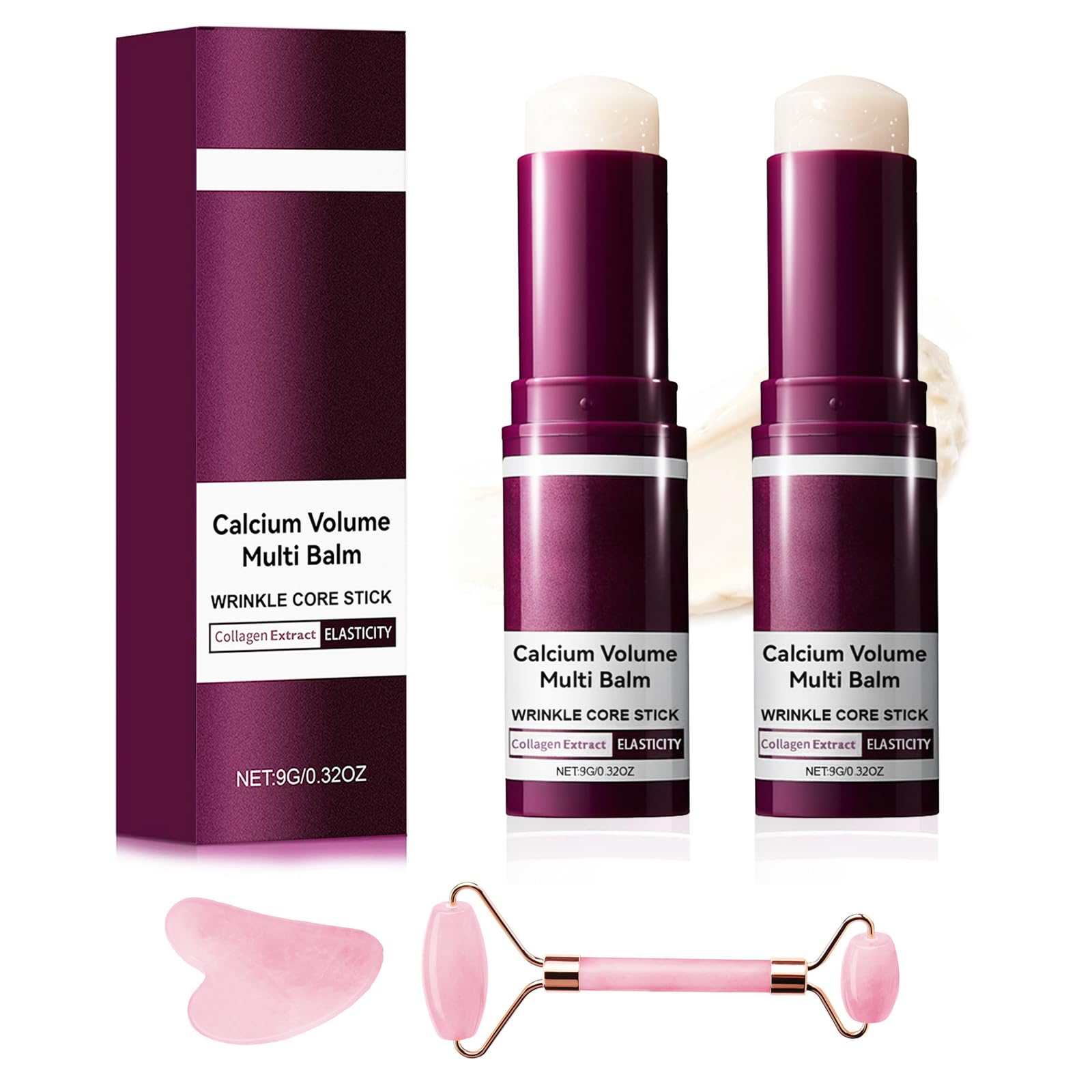 Package Contents: 2 calcium multi balm stick1 facial roller 1 gua sha board Calcium Stick for Face Features: 1. Designed for face, eye area, lips, neck, and targeted spots, this calcium multi balm offers versatile hydration and prep in a single stick, helping simplify your daily routine 2.This balm rich in moisturizing ingredients, repairs dry, tight skin, hydrates and nourishes it, leaving it soft and supple 3.Lightweight Texture:The Multi Balm's lightweight texture glides on smoothly without any greasy sensation and absorbs quickly, leaving skin clearer and more revitalized.Calcium stick makeup base does not pill,suitable for daytime touch-ups or nighttime repair.Portable Design: Calcium stick for face natural and gentle formula (no irritating ingredients), suitable for all skin types.Calcium volume multi balm stick features a rotating stick design that it requires no finger application, is hygienic and portable, and can be carried around for touch-ups. Lightweight Texture:The Multi Balm's lightweight texture glides on smoothly without any greasy sensation and absorbs quickly, leaving skin clearer and more revitalized.Calcium balm makeup base does not pill,suitable for daytime touch-ups or nighttime repair. Practical Set: Calcium stick comes with a facial roller and gua sha board set.Metal massage heads or cooling rollers provide an immediate physical cooling effect. This helps soothe the skin, reduce morning puffiness, and promote the absorption of skincare products, enhancing the overall user experience. Long-lasting Hydration: Calcium balm stick reduces moisture loss and keeps skin soft and moisturized for hours through calcium absorption and collagen stabilization.It helps repair dry and tight skin, providing long-lasting hydration. Multi-Purpose Care In One:This multi-functional balm combines Vitamin D, abundant antioxidants, and elastin to help improve skin elasticity and reduce collagen loss.This calcium multi balm stick is specially designed for the face, eye area, lips, neck, and other targeted skin areas, meeting multiple needs such as moisturizing and makeup base.