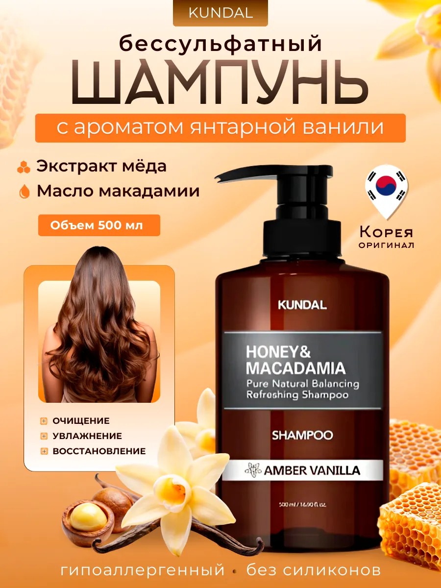 Шампунь Kundal Amber Vanilla с медом и макадамией, бессульфатный, 500 мл