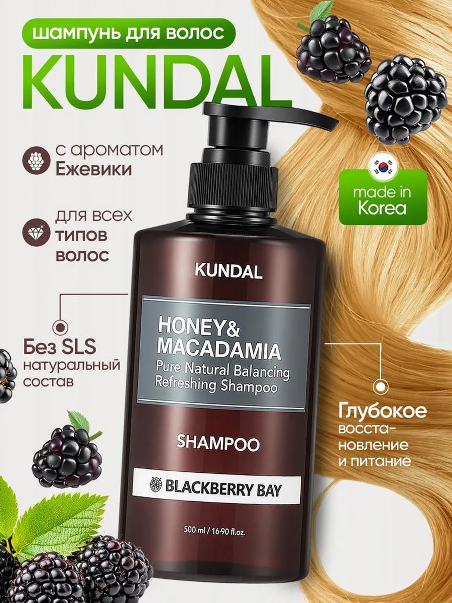 KUNDAL Кундал бессульфатный шампунь Blackberry Bay (аромат ежевики), 500 мл — профессиональный корейский шампунь для всех типов волос. Формула с маслами арганы и макадамии бережно очищает кожу головы, наполняет волосы влагой и питательными компонентами, регулирует работу сальных желёз и помогает избавиться от перхоти и жирности у корней.