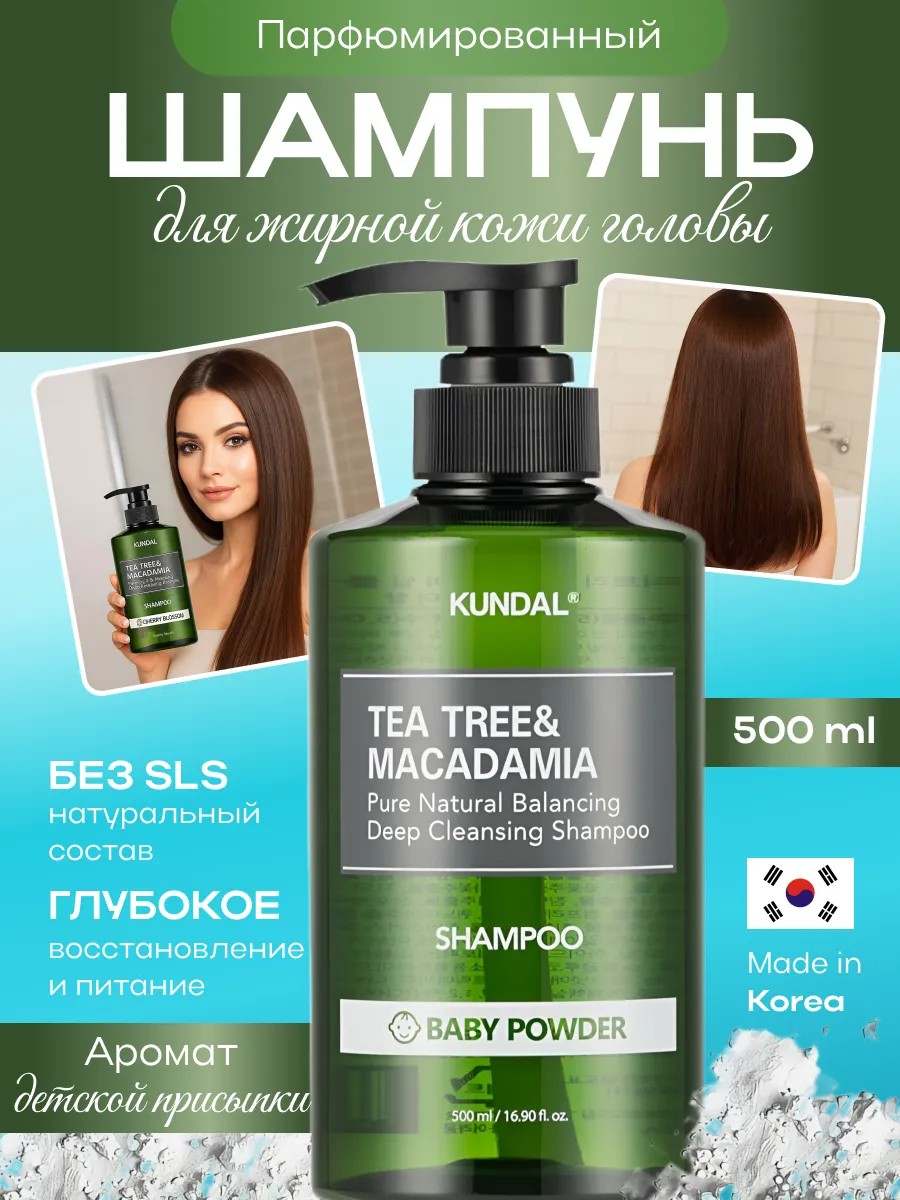| Полное наименование товара | KUNDAL Шампунь для волос очищающий Baby Powder Tea Tree and Macadamia Shampoo, 500 мл |