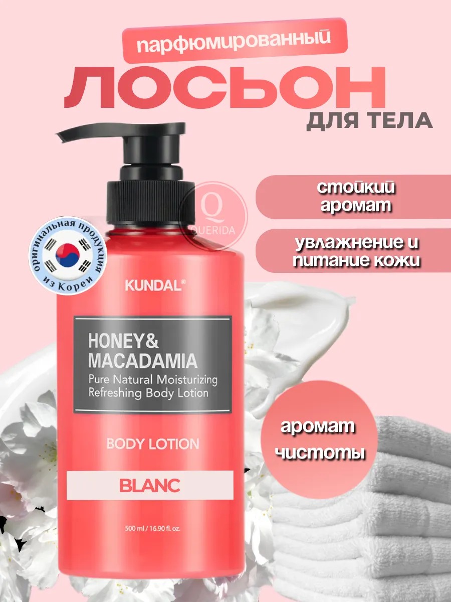 Гипоаллергенный глубоко увлажняющий лосьон Kundal Honey & Macadamia Body Lotion из Южной Кореи подарит вам оригинальный аромат и питание для вашей кожи на целый день. Парфюмированный питательный лосьон для тела можно применять до и после воздействия солнца и окружающей среды, он отлично увлажняет кожу, делая ее более упругой, бархатистой и эластичной. Это отличный бальзам для нанесения после использования скраба, пилинга, применяйте его после принятия душа и ванной для шелковистости и гладкости или для массажа. Содержит только натуральные ингредиенты, без парабенов. Травы и эфирные масла в составе оказывают расслабляющее и успокаивающее действие, как в спа салоне. Быстро впитывается, без липкой жирной пленки и не оставляя следов на одежде. Молочко интенсивно увлажнит даже обветренную , чувствительную аллергичную и атопичную кожу, устранит шелушения и смягчит даже грубые ороговевшие участки, поэтому его можно применять для локтей и пяток, ног и шеи.В холодное зимнее время отлично заменит крем для рук, когда требуется особая защита от непогоды и кожа может потрескаться от мороза и ветра. Шлейф аромата еще долго сохранится на теле, который понравится как и мужчинам, так и женщинам. Густая насыщенная структура и удобный флакон с дозатором позволяет долго и экономично расходывать содержимое. Подходит для ежедневного использования. Это идеальный подарок подруге, любимой женщине или коллеге. Натуральный увлажняющий и освежающий лосьон для тела с медом и макадамией помогает увлажнить кожу. Содержит экстракт листьев алоэ вера и 19 экстрактов растительного происхождения. Лосьон способствует гладкости кожи и ровности тона. Парфюмированный лосьон для тела дарит аромат на целый день, легко наносится и не дает ощущения липкости.