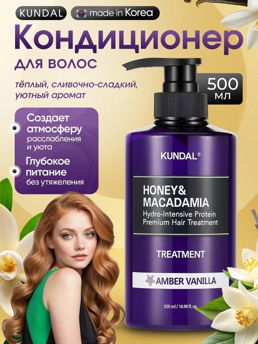Премиальный кондиционер KUNDAL с ароматом амбры и ванили создан для интенсивного восстановления и ухода за волосами любого типа. Формула с маслом макадамии и гидролизованным протеином глубоко питает и увлажняет, разглаживает кутикулу, устраняет сухость и ломкость. Волосы становятся мягкими, гладкими и послушными, легче расчесываются и дольше сохраняют свежесть.