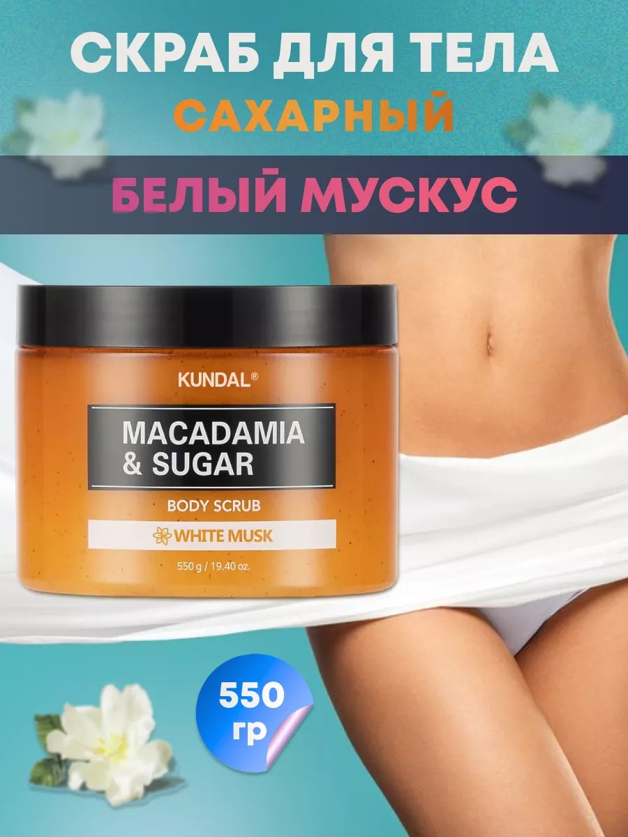 Experience softness and smoothness with the Macadamia & Sugar White Musk Body Scrub from Kundal! Natural sugar and shea butter help remove dead skin cells, tighten and soothe the skin, leaving it velvety smooth, just like after a spa treatment! The White Musk scent leaves a feeling of freshness and cleanliness. It doesn't overdry or damage, making it suitable for cleansing all skin types, even sensitive skin. Fine apricot kernel granules gently massage without irritating or damaging the skin, and provide excellent exfoliation. Contains hibiscus, known for its antioxidants, brightening and toning properties. Its alpha hydroxy acids act as natural exfoliants, helping stimulate renewal. Raspberry relieves irritation, promotes tissue healing, and reduces the severity of allergic reactions. Blueberry protects collagen from breakdown. Acai extract makes the skin smoother and more elastic, regulates water balance, tones, and improves firmness. Blueberry helps tighten sagging skin and protects it from stretching. Macadamia oil eliminates flaking and irritation. Strawberry leaves contain tannins, flavonoids, and essential oils for hydration and softening. This peel has an anti-cellulite effect and helps slightly reduce circumference. It is an important aid for slimming and weight loss, as self-massage with it targets fat deposits. The peel improves microcirculation and rejuvenates. Mechanical exfoliants accelerate blood circulation and metabolism, increasing the flow of oxygen and nutrients to tissues, which initiates the process of fat breakdown. It promotes skin tightening in problem areas, such as the stomach or arms. Apply the required amount and gently massage over the body. Rinse with warm water! A great gift option thanks to its stylish packaging design, effectiveness, and festive aroma.