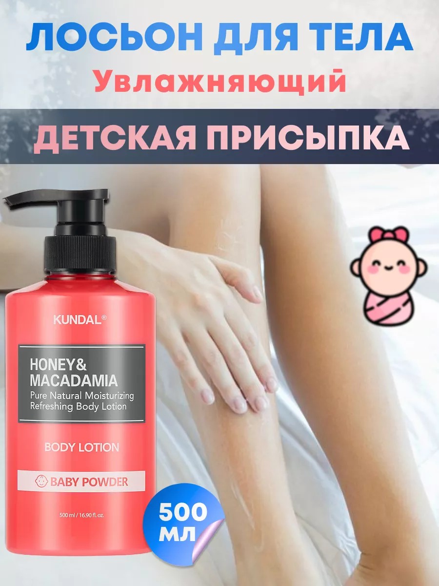 Гипоаллергенный глубоко увлажняющий лосьон Kundal Honey & Macadamia Body Lotion Baby Powder из Южной Кореи подарит вам оригинальный аромат и питание для вашей кожи на целый день. Парфюмированный питательный лосьон для тела можно применять до и после воздействия солнца и окружающей среды, он отлично увлажняет кожу, делая ее более упругой, бархатистой и эластичной. Это отличный бальзам для нанесения после использования скраба, пилинга, применяйте его после принятия душа и ванной для шелковистости и гладкости или для массажа. Содержит только натуральные ингредиенты, без парабенов. Травы и эфирные масла в составе оказывают расслабляющее и успокаивающее действие, как в спа салоне. Быстро впитывается, без липкой жирной пленки и не оставляя следов на одежде. Молочко интенсивно увлажнит даже обветренную , чувствительную аллергичную и атопичную кожу, устранит шелушения и смягчит даже грубые ороговевшие участки, поэтому его можно применять для локтей и пяток, ног и шеи.В холодное зимнее время отлично заменит крем для рук, когда требуется особая защита от непогоды и кожа может потрескаться от мороза и ветра. Шлейф аромата еще долго сохранится на теле, который понравится как и мужчинам, так и женщинам. Густая насыщенная структура и удобный флакон с дозатором позволяет долго и экономично расходывать содержимое. Подходит для ежедневного использования. Это идеальный подарок подруге, любимой женщине или коллеге.