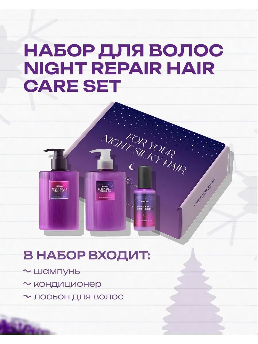 Наборы для ухода волос Night Repair Hair Care Set от KUNDAL— это идеальный набор для ночного ухода за волосами, который помогает восстановить их структуру, вернуть силу, мягкость и блеск. Продукты в наборе обогащены питательными ингредиентами, которые проникают глубоко в волосы и работают во время отдыха.