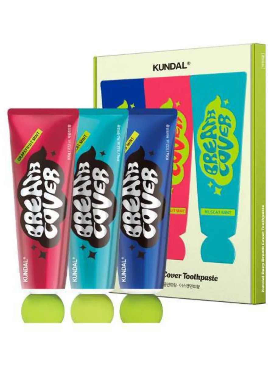 The Breath Cover toothpaste set from KUNDAL includes three unique toothpastes with different flavor profiles: Herb Mint, Grapefruit Mint, and Muscat Mint.