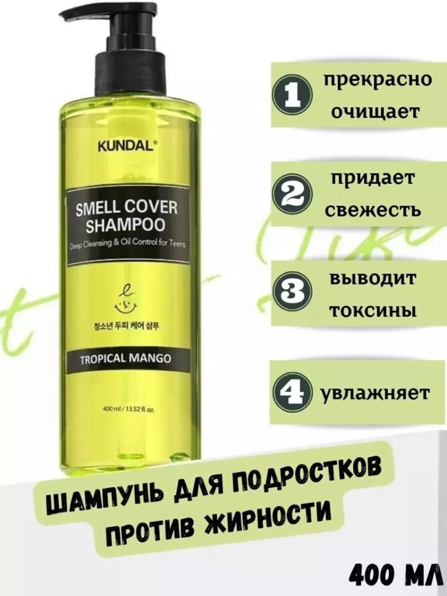 Шампунь для подростков SMELL COVER TEENS SHAMPOO Kundal с ароматом тропического манго – это специально разработанное средство, направленное на борьбу с жирностью волос. Его формула учитывает особенности подростковой кожи головы и помогает справиться с излишней жирностью, обеспечивая чистоту и свежесть на протяжении всего дня.