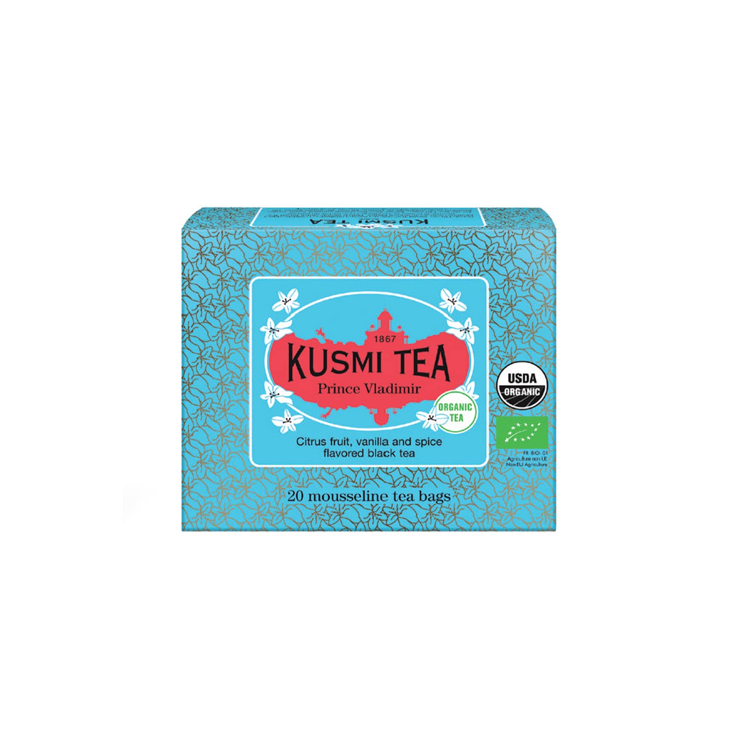 KUSMI TEA Our mission: to offer an exceptional experience to the widest possible audience, thanks to natural and responsibly sourced organic teas and infusions. Our expertise lies in creating infusions with new and original flavors, developed by our teams using a perfect understanding of natural aromas obtained from the finest fruits, flowers, and spices. For over 150 years, we have worked every day to reinvent our brand, making this experience even more exciting. That's why we carefully develop and manufacture quality products in our workshops in France and share our creations and knowledge through our stores and partners worldwide. "Prince Vladimir": black tea flavored with vanilla, cinnamon, citrus, and cloves. Organic product. 1 x 20 tea bags (40 grams). [ORIGINAL] - Kusmi Tea's unique character lies primarily in the creation of infusions with a new and original taste, developed using natural aromas obtained from the finest fruits, flowers, and spices. [THE STORY] - In 1867, Pavel Kousmichoff founded the tea house in Saint Petersburg. With immediate success, Kusmi tea became a favorite of the tsars. In 1917, fleeing the Russian Revolution, the family moved their business to Avenue Niel in Paris. [ECO-SUSTAINABLE] - Kusmi Tea reduces its carbon footprint by supporting production in France, limits the use of plastic in packaging, and has committed itself entirely to organic products with the generous support of the WWF. [PRINCE VLADIMIR] - A truly delicious organic black tea, with its tangy notes of grapefruit, orange, and lime blended with a bergamot base. A truly captivating tea, impossible to refuse if served by a prince! [THE PRODUCTS] - For over a century, Kusmi has been working daily to reinvent its own brand, developing. INGREDIENTS Black tea 95 , orange peel, cinnamon extract, natural vanilla flavoring, natural clove flavoring, citrus essential oils.Kusmi Tea Thé noir agrumes, vanille, épices Thé Noir Prince Vladimir Thé noir Cannelle, Vanille, Girofle, Agrumes - 20 FiltresDESCRIPTION DU PRODUIT DESCRIPTION DU PRODUIT KUSMI TEA Notre mission : offrir un moment d'exception au plus large public possible, grâce à des thés et infusions biologiques naturels et responsables. Notre savoir-faire réside dans la création d'infusions au goût nouveau et original, élaborées par nos équipes grâce à une parfaite connaissance des arômes naturels obtenus à partir des meilleurs fruits, fleurs et des meilleures épices. Ainsi, depuis plus de 150 ans, nous travaillons chaque jour à réinventer notre maison, pour rendre cette expérience encore plus passionnante. C'est pourquoi nous développons et fabriquons avec soin des produits de qualité dans nos ateliers en France et partageons nos créations et nos connaissances à travers nos mags et partenaires à travers le monde. "Prince Vladimir": thé noir aromatisé à la vanille, à la cannelle, aux agrumes et aux clous de girofle. Produit biologique. 1 x 20 sachets de thé (40 grammes). [ORIGINAL] - La particularité de Kusmi Tea réside avant tout dans la création d'infusions au goût nouveau et original, élaboré grâce aux arômes naturels obtenus à partir des meilleurs fruits, fleurs et des meilleures épices. [L'HISTOIRE] - En 1867, Pavel Kousmichoff fonde la maison de thé à Saint-Pétersbourg. Avec un succès immédiat, le thé Kusmi devient le préféré des tsars. En 1917, fuyant la révolution russe, la famille déménage son commerce avenue Niel à Paris. [ECO-DURABLE] - Kusmi Tea réduit l'empreinte carbone en soutenant la production en France, limite l'utilisation de matières plastiques dans les emballages, a décidé de se consacrer entièrement au bio avec le mécénat bienveillant du WWF. [PRINCE VLADIMIR] - Thé noir bio vraiment délicieux, avec ses notes acidulées de pamplemousse, d'orange et de citron vert mélangées à une base de bergamote. Un thé vraiment fascinant, auquel on ne peut dire non s'il est servi par un prince ! [LES PRODUITS] - Kusmi, depuis plus d'un siècle, travaille chaque jour à réinventer sa propre maison, développant des pr. INGRÉDIENTS Thé noir 95 , zeste d'orange, extrait de cannelle, arôme naturel de vanille, arôme naturel de clou de girofle, huiles essentielles d'agrumes.