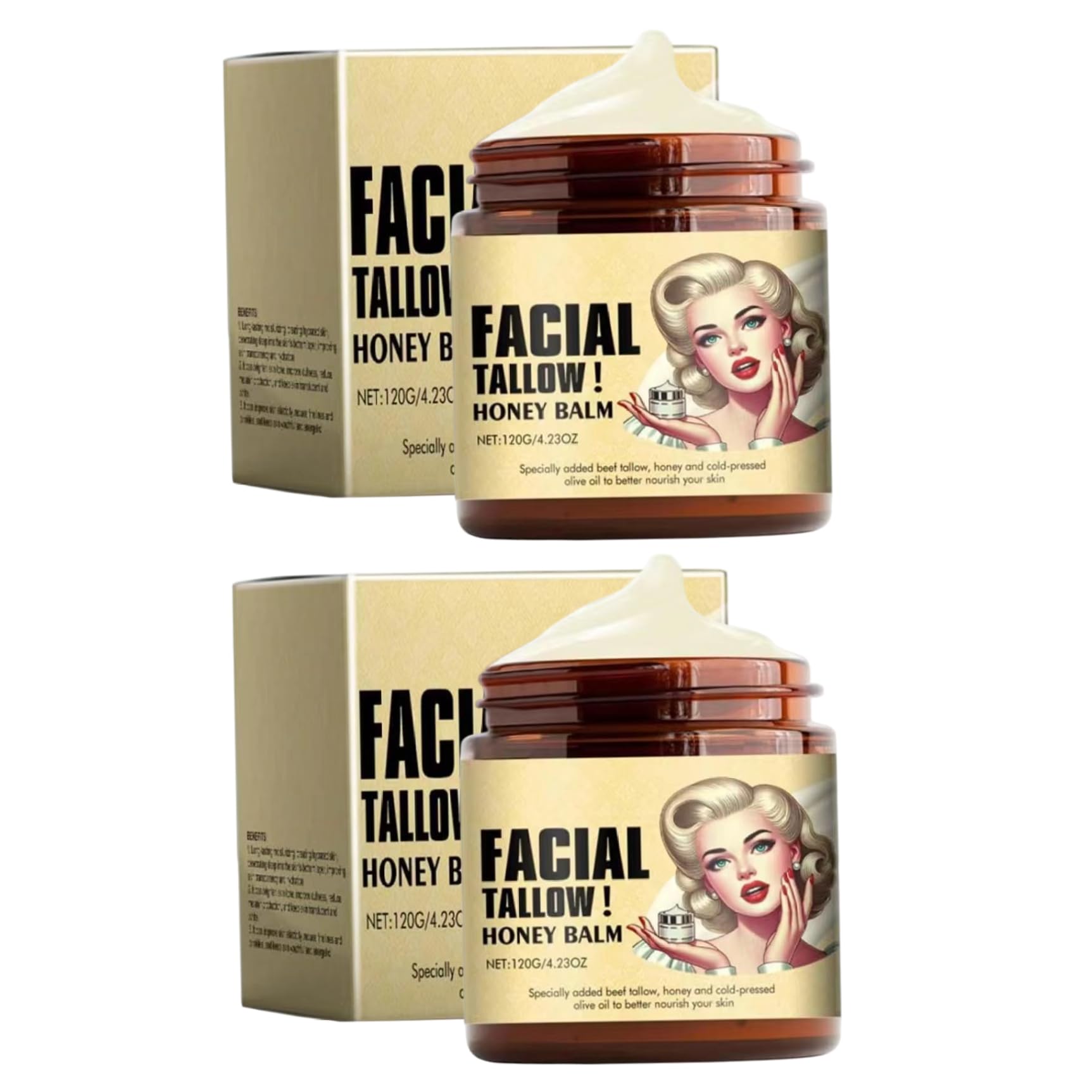 Description: Experience the natural power of our Whipped Tallow and Honey Balm, crafted to exceptional moisturization for all skin types. This 120g balm features a unique whipped texture that glides smoothly onto skin without feeling heavy or greasy. Formulated with nutrient-rich beef tallow and honey, it provides essential Vitamins D and E along with fatty acids that deeply nourish and improve skin texture. The versatile formula works effectively as a face cream, body moisturizer, hand treatments, and lip conditioner, making it your skincare solution. Specifically designed for sensitive skin, this balm contains no essential oils or fragrances, making it safe for those with eczema, rosacea, or dryness concerns. Embrace natural skincare that visible results without chemical additives. Features:. Whipped Tallow Honey Balm. -Size: Net content: 120g. Note: Manual measurement, please allow slight errors on size. The colors may exist slight difference due to different screens. Package Including 2 x Whipped Tallow Honey Balm