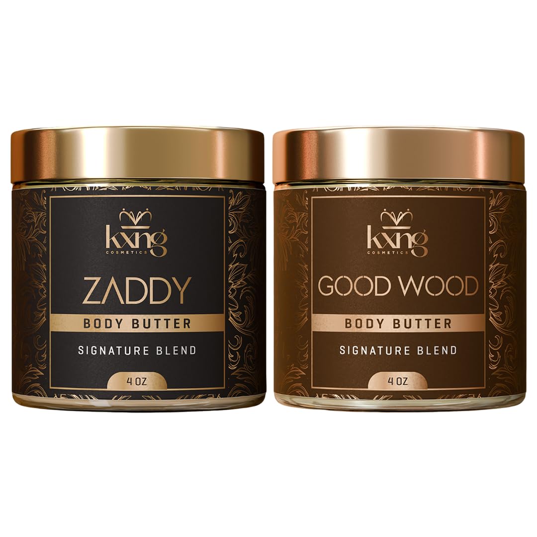 Body Butters, Creams, and Skin Care Moisturizers by KXNG Cosmetics. Pheromone Infused Men's body lotion is for all skin types: extremely dry skin, combination, dry, mature, normal, oily, and sensitive. Natural Organic Skin Care ingredients include organic whipped shea butter, cocoa butter, mango butter, kokum butter, coconut oil cream, vitamins, and essential oils for skin, including sweet almond oil, rosehip oil, argan oil, vitamin E oil, and jojoba oil. Body Butters for men can help replenish the skin's natural oils and protect the skin from stressors that would otherwise exacerbate dryness or irritation. Body Butter and lotions for men can help replenish skin's natural oils and protect the skin from stressors that would otherwise exacerbate dryness or irritation. Superior hydration while forming a protective barrier to lock in moisture all day long. The rich, non-greasy formula provides intense moisture and nourishment to revive dry, cracked skin. Body Butters are lightweight but offer heavy-duty hydration thanks to the concentration of plant-based butters and oils. Skin will moisturize in the benefits immediately, feeling supple and comfortable even in harsh weather conditions. Extra thick body butter infused with Shea Butter, Raw Cocoa Butter, and Kokum Butter, softens rough skin and provides twenty-four hours of deep hydration. Fall in love with the creamy texture that benefits your hands, legs, feet, back, stomach, and body. Our body butter contains ethically and sustainably sourced organic, cruelty-free ingredients and is handmade in the USA. Our body butter contains NO Parabens, Phthalates, Mineral oils, or artificial colors. Bring out your skin's naturally healthy glow with KXNG Cosmetics' Body Butter. Give your skin the nourishment it craves and treat it to deep, long-lasting hydration.? : Made with natural butters and oils, slight variations in texture may occur. Temperature changes during storage or transit may cause softening, melting, or small white spots—normal crystallization that does not affect quality, performance, or safety. , : Strengthen your skin's natural barrier with nutrient-rich oils ideal for daily use. Perfect for rough and bumpy skin, vacations, summer hydration, anti-chafing, post-shower nourishment, bald head shine, and on-the-go travel. A versatile men's body butter that keeps you protected and smooth anytime, anywhere. ?' , - : Experience next-level softness with a rich whipped body butter that melts into your skin. It quenches dryness, boosts moisture retention, and enhances skin texture—leaving your body irresistibly smooth, firm, and revitalized without any greasy feel. A must-have moisturizer for men seeking powerful hydration. : Our rich shea body butter melts effortlessly into the skin, providing deep, long-lasting moisture. Perfect as a body butter for dry skin, delivering softness and comfort after showers or during cold weather. : Enjoy a luxurious fragrance crafted from spicy black pepper and smooth vanilla. This captivating aroma makes it an excellent body butter for women who love to smell good and a sophisticated, warm option for body butter for men.