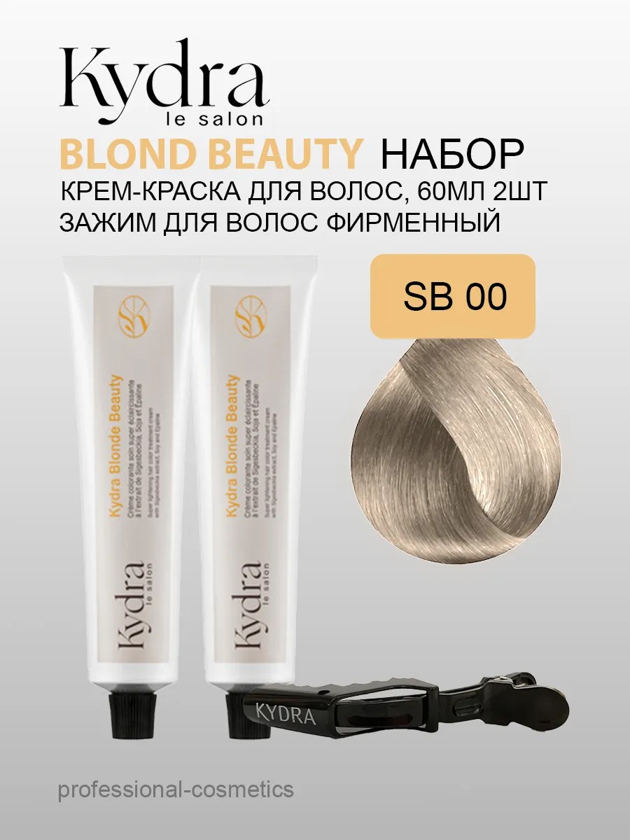 The Kydra SB00 Ultra Natural Blonde professional cream hair color gift set includes two 60 ml bottles and a convenient clip.