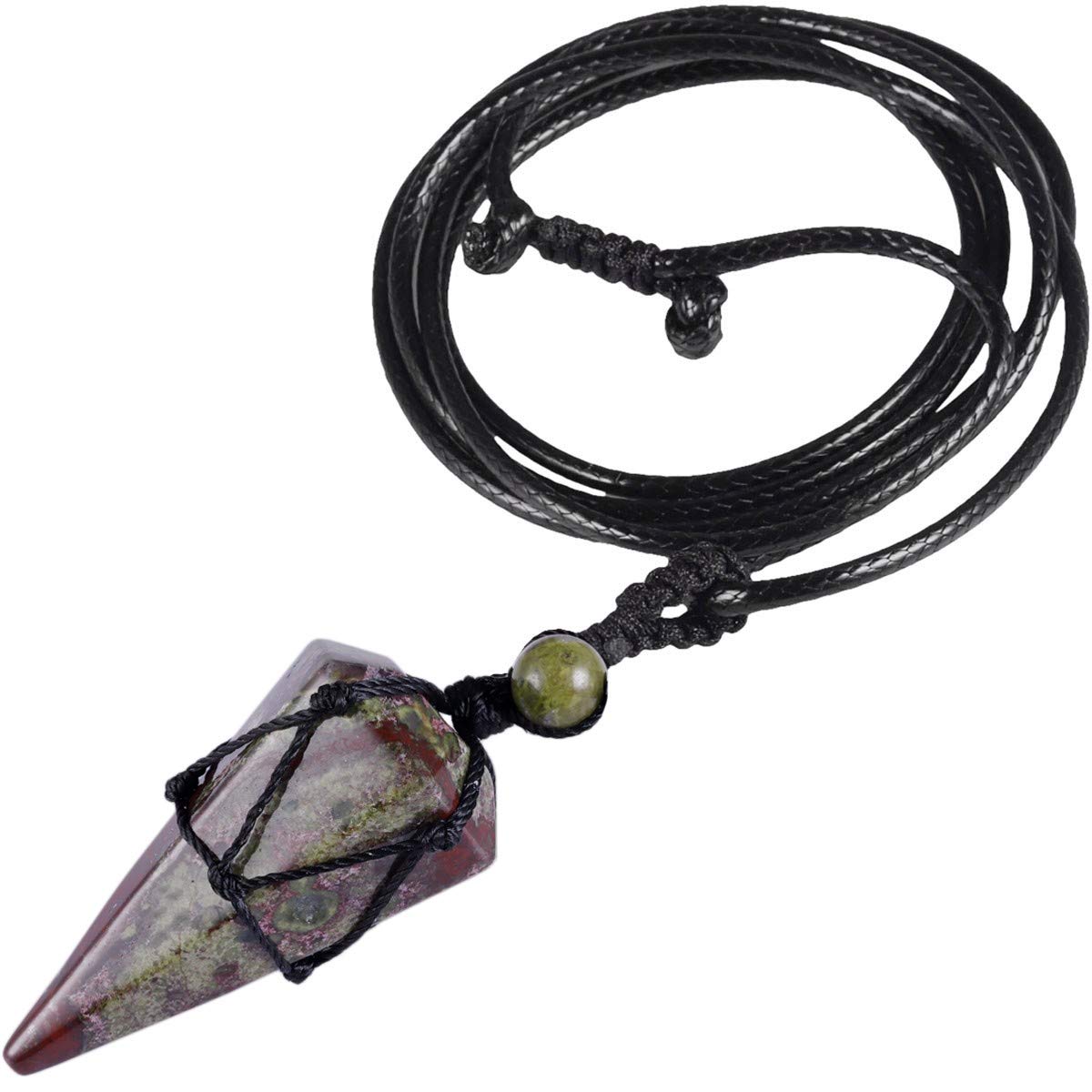 Crystal point chain size: total length is 29-47 cm.The circumference of the leather rope can be set from 46 cm to 82 cm, 0.2 cm thick.The pendant size: length 57-65 mm, stone cup 3.5-4 cm, diagonal 20 mm, pearls 6 mm, the total weight is approx. 15-17 grams. Great gift: Hexagonal pendant pendulum necklace for women and men get one asWonderful gift for friends, family or lovers at Christmas, Valentine's Day, anniversary, parties or birthday.We give you a gift bag that you can use for packaging.As a pendulum: can be used for fortune tellers, worship, magic, hypnosis, etc.Therefore, polished hexagonal crystal pointed stone pendulum is ideal for rituals, aura, healing, meditation or chakras.If you wear this Reiki healing necklace, let it stay with you, reduce the negative energy.As a clothing accessory: the hexagonal geman necklace is very nice, can be combined with a variety of clothing, which increases your own beauty, and does not sound monotonous, more connotation.Carefully designed: The Reiki healing trailer consists of a small round pearl and a hexagonal gem that is wrapped around a nylon rope.The gem is polished so that it feels comfortable when it comes into contact with the skin.Thin nylons rope prevents the falling quartz pointed stone.Since each piece of jewelry is unique, texture, size, color, etc. can differ slightly from the image.Kristallpunktkette grösse: Gesamtlänge beträgt 29-47 cm. Der Umfang der Lederseil kann von 46 cm bis 82 cm eingestellt werden, 0.2 cm dick. Der Anhänger grösse: Länge 57-65 mm,Steinlänger 3.5-4 cm, Diagonale 20 mm, Perlen 6 mm, Das Gesamtgewicht beträgt ca. 15-17 Gramm. Tolles Geschenk: Hexagonal Anhänger Pendel Halskette für Damen und Herren holen sie sich eines als wunderbares Geschenk für Freunde, Familie oder Ihren Liebhaber an Weihnachten, Valentinstag, Jubiläum, Partys oder Geburtstag. Wir geben Ihnen eine Geschenktüte, die Sie zum Verpacken verwenden können. Als Pendel: Kann für Wahrsagen, Anbetung, Magie, Hypnose usw. verwendet werden. Daher ist Polierte Hexagonal Kristall Spitz Stein Pendel ideal für Rituale, Aura, Heilung, Meditation oder Chakren. Tragen Sie diese Reiki Heilung Halskette lass es bei dir bleiben, reduziert die negative Energie. Als Bekleidungsaccessoire: Der Sechseckiger Edelstein Halskette ist sehr schön, kann mit einer Vielzahl von Kleidungsstücken kombiniert werden, wodurch die eigene Schönheit erhöht wird, und sich nicht eintönig, mehr Konnotation ergibt. Sorgfältig entworfen: Der Reiki Heilung Anhänger besteht aus einer kleinen runden Perle und einem Sechseckiger Edelstein, der um eine Nylonseil gewickelt ist. Der Edelstein ist poliert, damit er sich angenehm anfühlt, wenn er mit der Haut in Berührung kommt. Dünner Nylonseil verhindert das Herunterfallen von Quarz Spitz Stein Anhängern. Da jedes Schmuckstück ein Unikat ist, können Textur, Größe, Farbe usw. geringfügig vom Bild abweichen.KYEYGWO Sechseckiger Kristall Anhänger Halskette mit Einstellbare Lederseil, Polierte Quarz Spitz Stein Heilung Reiki Pendel Kette Rot Grün