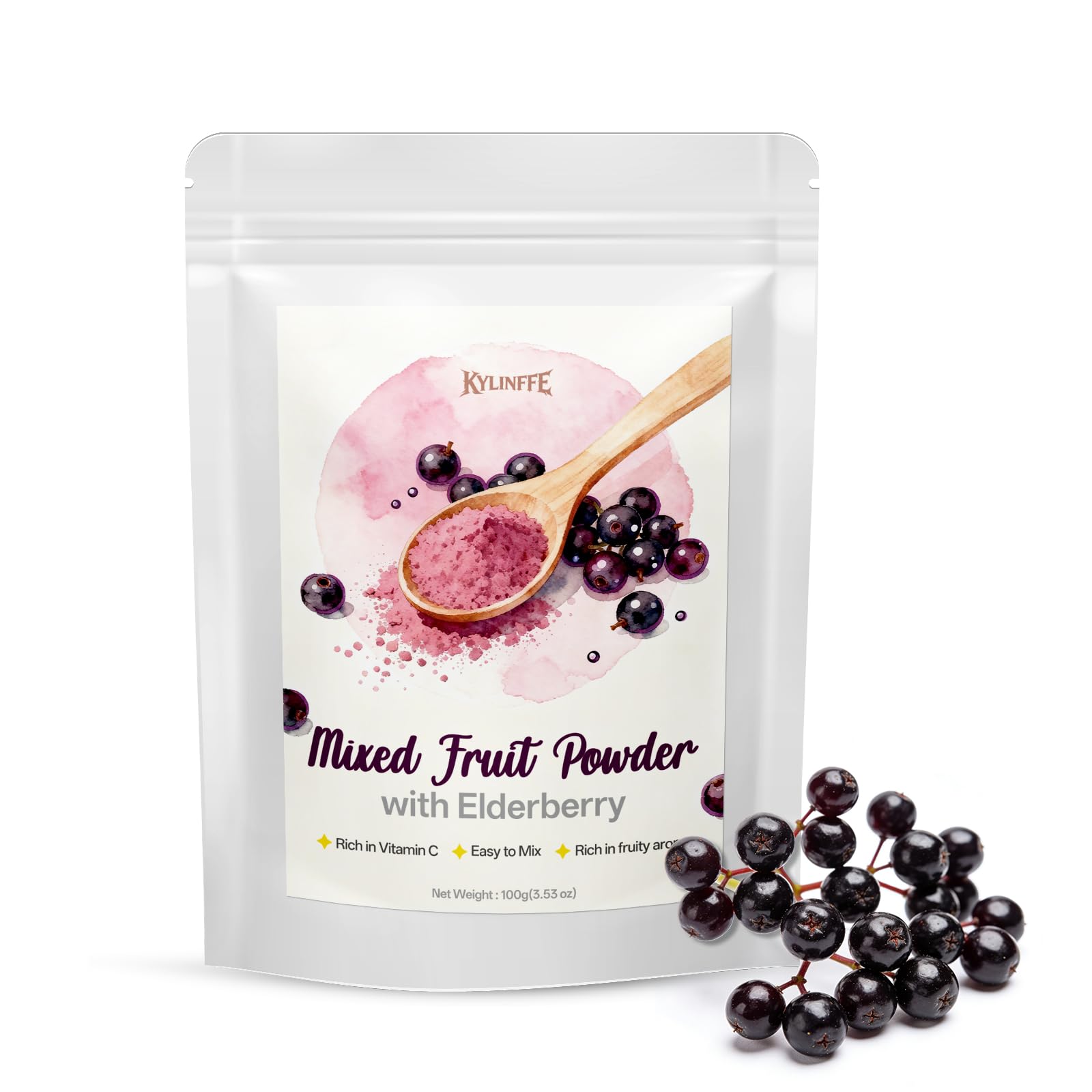 Kylinffe Elderberry Powder with Vitamin C & Antioxidants | Rich in Anthocyanins | Sambucus Elderberry Quick-Dissolve for Drinks & Smoothies | Portable Packaging 3.53oz