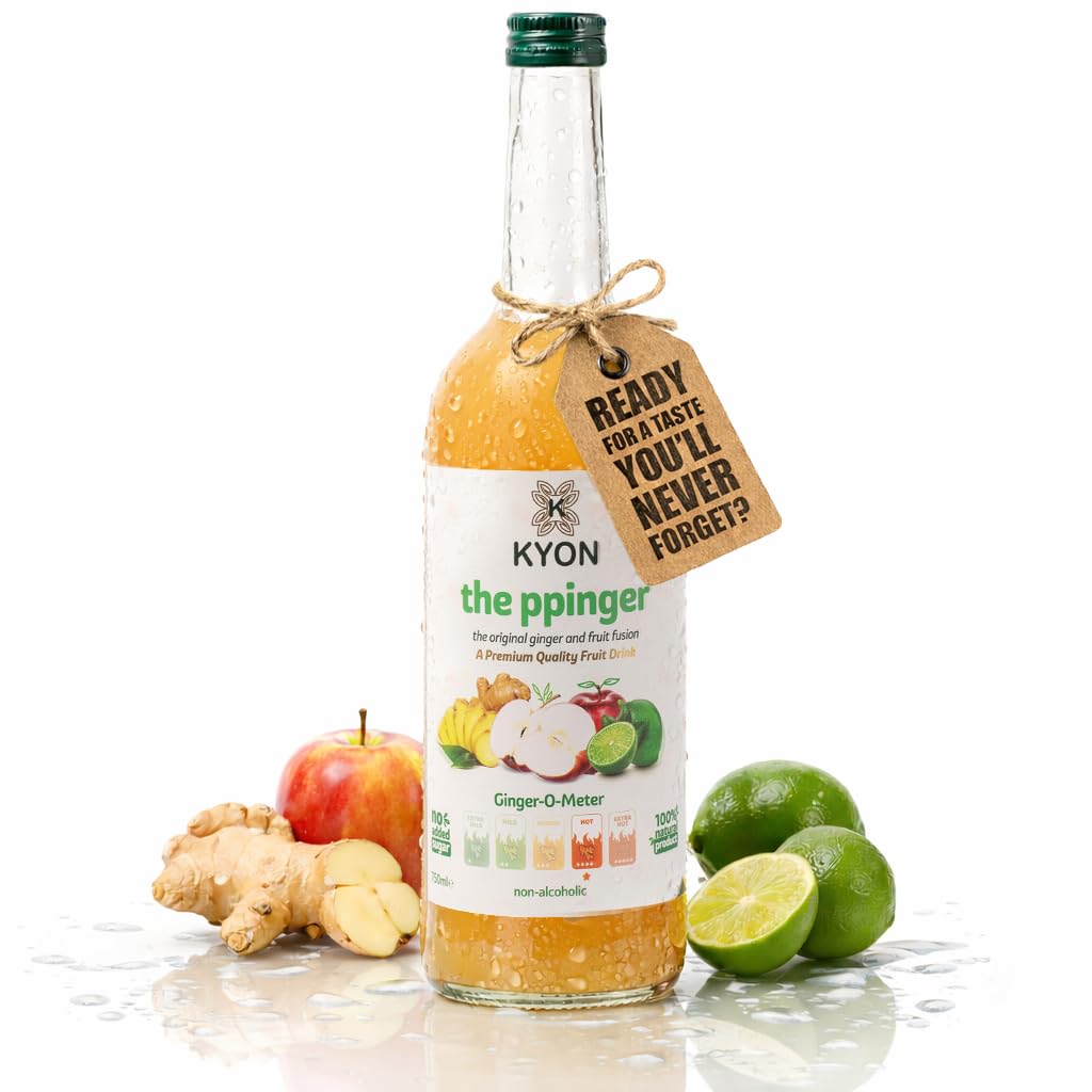 Ppinger, the perfect blend of intense flavor and refinement. This delicious ginger drink combines the zesty taste of fresh ginger with the crisp freshness of apple, the floral notes of elderflower, and the tang of lime to create an invigorating non-alcoholic beverage that stands apart from sugary, fizzy sodas. It all started as a homemade recipe shared over lunch, a drink created simply to bring warmth, balance, and joy to the moment. Friends asked for more, the recipe evolved, and what began as a small experiment became a beloved drink for its unmistakable ginger flavor. Every 250ml bottle holds that story. Made with real fruit juices and fresh ginger, this ginger juice is naturally fruity, lightly sweetened, and free of artificial flavors or additives. Serve it chilled for a refreshing kick, warm for a gentle ginger heat, or incorporate it into creative mocktails for your guests. Whether you're hosting, giving as a gift, or simply enjoying a quiet evening at home, this healthy ginger drink transforms every moment into a memorable one. Gently shake before serving and let the flavor unfold.ELEGANT 750ML BOTTLES TO SHARE – Presented in beautiful 750ml glass bottles and available in packs of 4, 6, and 12, this ginger juice is ideal for gifting, entertaining, keeping on hand, or adding a touch of elegance to your bar. Shake well before use to release the full flavor of Ppinger. ENJOY IT YOUR WAY – HOT, COLD, OR MIXED – Enjoy this healthy ginger drink ice-cold for a refreshing boost, slightly warm for comforting warmth, neat, on the rocks, or in a mocktail. A versatile ginger drink that elevates everyday moments and special occasions alike. GINGER SCALE – HEAT LEVEL – Rated HOT on the ginger scale, Ppinger ginger juice delivers an intense, invigorating warmth that awakens the senses, while maintaining a beautiful balance with fruity and floral notes. REAL GINGER AND BOTANICAL INGREDIENTS – Crafted with fresh, pungent ginger, crisp apple, fragrant elderflower, and tangy lime, this botanical ginger drink delivers a naturally balanced, sweet, vibrant, and unforgettable flavor from the first sip to the last. A DELICIOUS, ALCOHOL-FREE EXPERIENCE – Ppinger isn't just a ginger drink. It's an intense and complex, alcohol-free flavor experience created for those who crave authentic taste. Every sip offers warmth, coolness, and depth, with no bubbles or artificial sugar.Ppinger, l'alliance parfaite entre saveur intense et raffinement. Cette délicieuse boisson au gingembre allie la saveur piquante du gingembre frais à la fraîcheur croquante de la pomme, aux notes florales de la fleur de sureau et à l'acidité du citron vert pour créer une boisson sans alcool vivifiante qui se distingue des sodas sucrés et gazeux. Tout a commencé par une recette maison partagée lors d'un déjeuner, une boisson créée simplement pour apporter chaleur, équilibre et joie à l'instant présent. Les amis en redemandaient, la recette a évolué et ce qui n'était au départ qu'une petite expérience est devenu une boisson appréciée pour son goût de gingembre incomparable. Chaque bouteille de 250 ml renferme cette histoire. Élaboré à partir de vrais jus de fruits et de gingembre frais, ce jus de gingembre est naturellement fruité, légèrement sucré et sans arômes ni additifs artificiels. Servez-le frais pour un coup de fouet rafraîchissant, chaud pour une douce chaleur gingembre, ou incorporez-le dans des mocktails créatifs pour vos invités. Que ce soit pour recevoir, offrir ou simplement profiter d'une soirée tranquille à la maison, cette boisson saine au gingembre transforme chaque instant en un moment mémorable. Agitez doucement avant de servir et laissez la saveur s'exprimer.ÉLÉGANTES BOUTEILLES DE 750 ML À PARTAGER – Présenté dans de magnifiques bouteilles en verre de 750 ml et disponible en packs de 4, 6 et 12, ce jus de gingembre est idéal à offrir, à recevoir, à avoir sous la main ou à ajouter une touche d'élégance à votre bar. Bien agiter avant utilisation pour libérer toute la saveur de Ppinger. À DÉGUSTER À VOTRE FAÇON – CHAUD, FROID OU MIXTE – Savourez cette boisson saine au gingembre bien fraîche pour une touche de fraîcheur, légèrement chaude pour un réconfort réconfortant, pure, sur glace ou en cocktail sans alcool. Une boisson au gingembre polyvalente qui sublime les moments du quotidien comme les occasions spéciales. ÉCHELLE DE GINGEMBRE – NIVEAU DE CHALEUR – Classé dans la catégorie CHAUDE sur l'échelle de gingembre, le jus de gingembre Ppinger offre une sensation de chaleur intense qui éveille les sens, tout en conservant un bel équilibre grâce à ses notes fruitées et florales. DU VRAI GINGEMBRE ET DES INGRÉDIENTS BOTANIQUES – Élaborée à partir de gingembre frais et piquant, de pomme croquante, de fleur de sureau parfumée et de citron vert acidulé, cette boisson au gingembre aux ingrédients botaniques offre une saveur naturellement équilibrée, douce, vive et inoubliable, de la première à la dernière gorgée. UNE EXPÉRIENCE SAVOUREUSE SANS ALCOOL – Le Ppinger n'est pas une simple boisson au gingembre. C'est une expérience gustative intense et complexe, sans alcool, créée pour ceux qui recherchent des saveurs authentiques. Chaque gorgée offre chaleur, fraîcheur et profondeur, sans bulles ni sucre artificiel.Kyon The Ppinger – Jus de gingembre 750 ml avec pomme, citron vert et fleur de sureau, boisson rafraîchissante et sans alcool, disponible en packs de 4