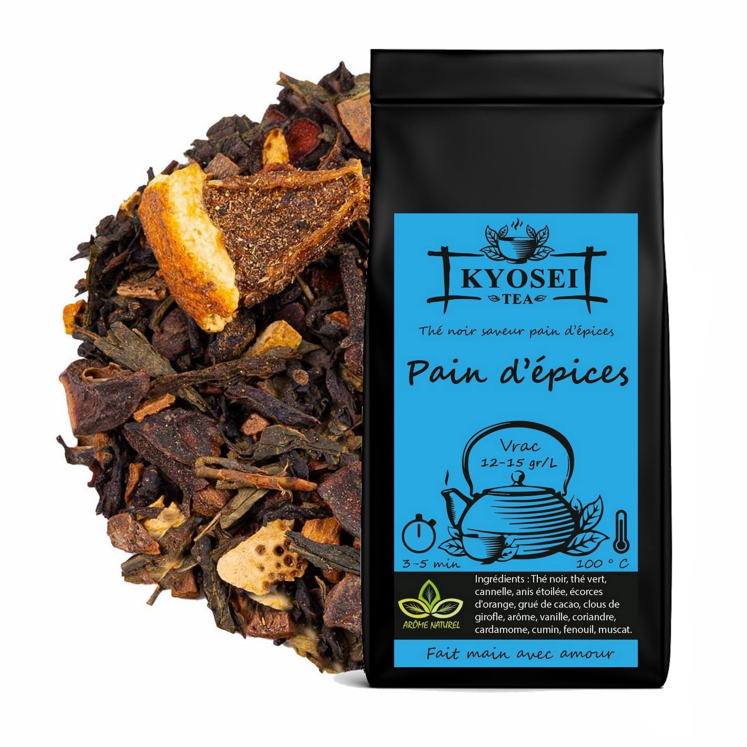 : Treat yourself to a gourmet escape with Kyosei Tea – Gingerbread Black Tea, a warming creation that evokes the comforts of winter and the aromas of Christmas. This blend combines three exceptional black teas (Ceylon, South India, and China) with a medley of spices: cinnamon, cloves, cardamom, star anise, anise, nutmeg, fennel, coriander… enhanced with a touch of orange, cocoa, and vanilla. The result? A rich, spicy, and velvety cup, where every sip warms the heart and awakens the senses. The presence of Sencha green tea adds a subtle vegetal nuance that balances the roundness of the spices. This Gingerbread Black Tea is an invitation to indulgence and conviviality—a festive blend to enjoy in any season, hot or as a spiced latte. Ingredients: Ceylon black tea, South India, China, cinnamon pieces, China Sencha green tea, broken star anise, orange peel, crushed cocoa bean, cloves, flavouring, orange slices, bread spices (coriander, cumin, fennel, anise, nutmeg), ground cardamom, vanilla.Premium loose leaf guaranteed freshness – Carefully packaged in a resealable bag to preserve the richness of the spices and the depth of the black tea. ? Aromatic comforting infusion – Perfect for a cozy moment, accompanied by dessert or simply for a relaxing winter treat. Handcrafted balanced blend – With China Sencha green tea, bread spices (anise, nutmeg, cumin, coriander, fennel), and real dried orange slices. Festive flavor winter comfort – Warm notes of gingerbread, cinnamon, cloves, and cardamom, combined with cocoa beans and orange peel for a generous and indulgent cup. Rich comforting blend – A combination of black teas from Ceylon, South India, and China, enhanced with a bouquet of traditional spices and a touch of vanilla.Description du produit Offrez-vous une escapade gourmande avec Kyosei Tea – Thé Noir Pain d'Épices, une création chaleureuse qui évoque les douceurs d'hiver et les effluves de Noël. Ce mélange associe trois thés noirs d'exception (Ceylan, Inde du Sud et Chine) à une farandole d'épices : cannelle, clou de girofle, cardamome, badiane, anis, muscade, fenouil, coriandre… relevés d'une touche d'orange, de cacao et de vanille. Le résultat ? Une tasse riche, épicée et veloutée, où chaque gorgée réchauffe le cœur et éveille les sens. La présence de thé vert Sencha apporte une nuance végétale subtile qui équilibre la rondeur des épices. Ce thé noir Pain d'Épices est une invitation à la gourmandise et à la convivialité — un mélange festif à savourer en toute saison, chaud ou en latte épicé. Ingrédients Thé noir Ceylan, -Inde du Sud, -Chine, morceaux de cannelle, thé vert China Sencha, badiane cassée, écorces d'orange, fève de cacao concassée, clou de girofle, arôme, tranches d'orange, épices à pain (coriandre, cumin, fenouil, anis, noix de muscade), cardamome moulue, vanille.Vrac premium fraîcheur garantie – Conditionné avec soin dans un sachet refermable, pour préserver la richesse des épices et la profondeur du thé noir. ? Infusion aromatique enveloppante – Parfaite pour un moment cocooning, accompagnée d'un dessert ou d'un simple instant de détente hivernale. Composition artisanale équilibrée – Avec du thé vert China Sencha, des épices à pain (anis, muscade, cumin, coriandre, fenouil) et de véritables tranches d'orange séchées. Saveur de fête douceur d'hiver – Notes chaudes de pain d'épices, cannelle, clou de girofle et cardamome, mariées à la fève de cacao et aux écorces d'orange pour une tasse généreuse et gourmande. Mélange riche réconfortant – Association de thés noirs de Ceylan, Inde du Sud et Chine, relevée d'un bouquet d'épices traditionnelles et d'une touche de vanille.Kyosei Tea – Thé Noir Premium "Pain d'Épices" – Vrac 100g – Mélange de Thés Noirs Vert avec Cannelle, Orange, Vanille Épices Gourmandes