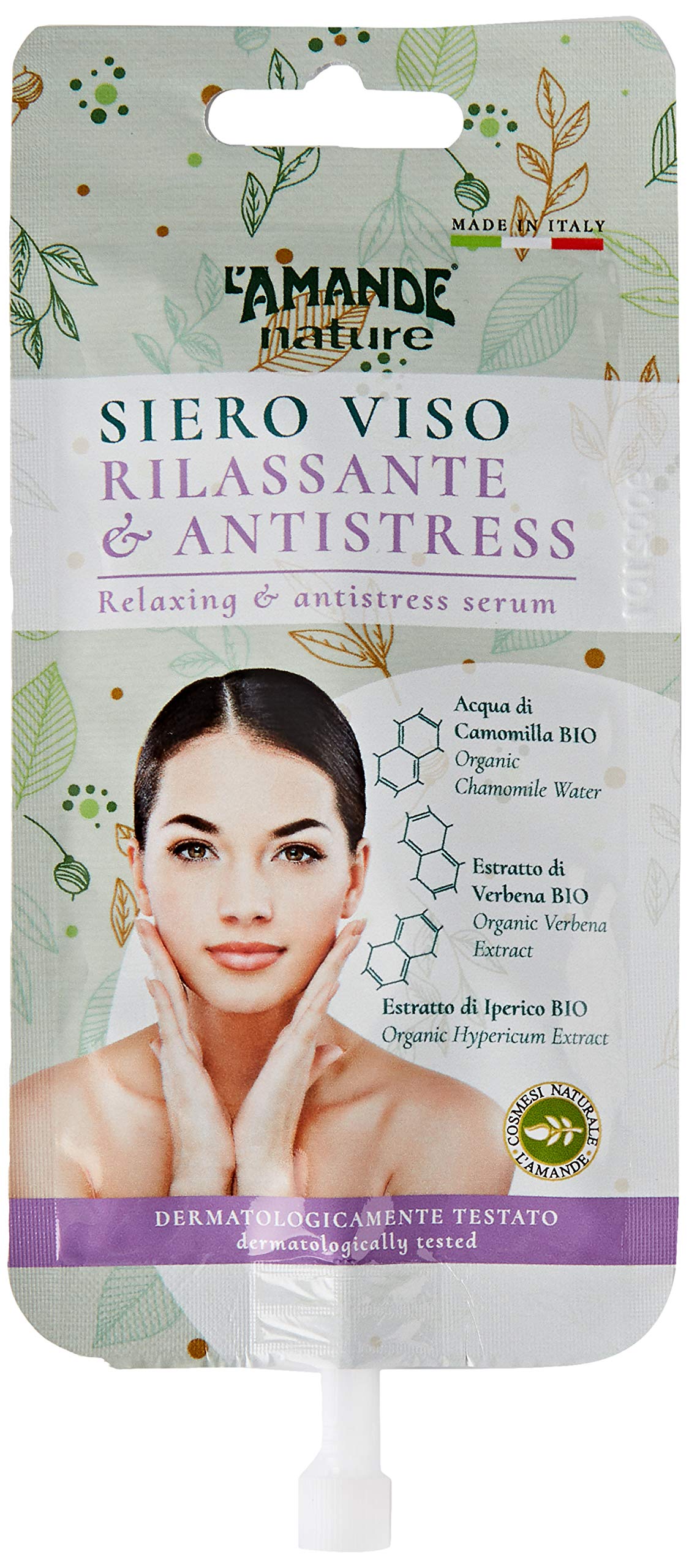 This facial serum, rich in active ingredients with calming and relaxing properties, leaves skin feeling fresh and refreshed. The formula, with its fresh and fruity fragrance, is enriched with organic verbena extract and chamomile water, known for their calming, decongesting, and relaxing action organic St. John's wort extract, with its refreshing and soothing properties and lotus flower extract, for its delicate and revitalizing action. Perfect before an evening out or a special event, for soft, fresh, and relaxed skin. Directions for use: Open the pouch. Apply the serum evenly to the entire face, avoiding the eye and lip areas, massaging until completely absorbed. Reseal the pouch after application. Apply morning and evening to clean skin. INGREDIENTS Aqua, propylene glycol, propanediol, methylpropanediol, chamomilla recuptita flower water, hypericum perforatum extract, verbena officinalis extract, bisabolol, lotus corniculatus flower extract, citrus limon peel extract, sodium hyaluronate, glyceryl caprylate, glycerin, caprylic capric triglyceride, pentylene glycol, glyceryl undecylenate, phenylethyl resorcinol, citric acid, ammonium acryloyldimethyltaurate vp copolymer, polysorbate 20, sodium benzoate, potassium sorbate, benzyl alcohol, dehydroacetic acid, butylmethoxydibenzoyl methane, perfumeOrganic lemon peel extract: from organic farming, with a delicate astringent, brightening, and revitalizing action. 91 naturally derived ingredients in the formula. Product weight: 15ml.SIERO VISO RELASSANT ANTISTRESS 15 ML Relaxant et anti-stressDESCRIPTION DU PRODUIT DESCRIPTION DU PRODUIT Sérum visage, riche en actifs aux propriétés calmantes et relaxantes, donne à la peau une sensation de fraîcheur et de bien-être. La formulation, par la fragrance fraîche et fruitée, est enrichie de l'extrait de verveine et de l'eau de camomille d'agriculture biologique, de l'action calmante, décongestionnante et relaxante extrait d'hyperïque biologique, des propriétés rafraîchissantes et apaisantes et de l'extrait des fleurs de lotus par l'action délicate et revitalisante. Parfait avant une soirée ou un événement excellent, pour une peau douce, fraîche et détendue. Mode d'emploi : ouvrir le buste Appliquer le sérum uniformément sur tout le visage, en excluant le contour des yeux et des lèvres, massant jusqu'à l'absorption complète. Refermer la pochette une fois l'application. Appliquer le soir et le matin sur peau propre et propre. INGRÉDIENTS Aqua, propylene glycol, propanediol, methylpropanediol, chamomilla récuptita flower water, hypericum perforatum extract, verbena officinalis extract, bisabolol, lotus corniculatus flower extract, citrus limon peel extract, sodium hyaluronate, glyceryl caprylate, glycerin, caprylic capric triglyceride, pentylene glycol, glyceryl undecylenate, phenylethyl resorcinol, citric acid, ammonium acryloyldimethyltaurate vp copolymer, polysorbate 20, sodium benzoate, potassium sorbate, benzyl alcohol, dehydroacetic acid, butylmethoxydibenzoyl methane, parfumExtrait de scorce de citron biologique : d'agriculture biologique, à l'action délicate astringente, éclairante et revitalisante. 91 d'ingrédients d'origine naturelle en formule. Poids du produit :15ml.