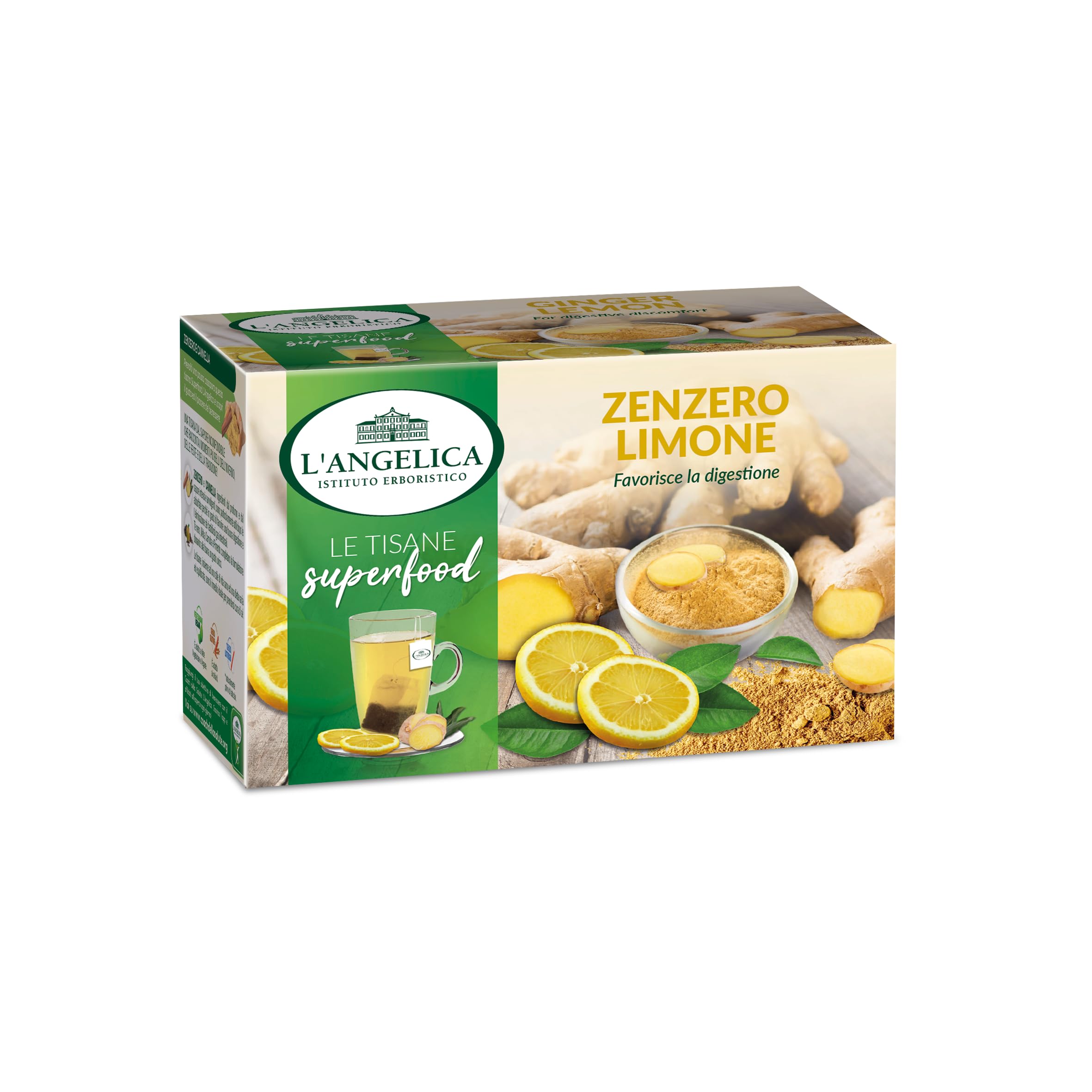 Ginger and Lemon Functional Herbal Tea – Ginger and lemon herbal tea is the ideal product for those experiencing digestive difficulties. Ginger and lemon help regulate gastrointestinal motility and eliminate gas. Furthermore, ginger is beneficial for combating nausea, regulating cardiovascular function, promoting good blood circulation, improving joint health, and addressing menstrual cycle irregularities. INGREDIENTS Ginger (Zingiber officinalis Rosc. - rice), lemongrass (Cymbopogon flexuosus Stapf. - leaf), lemon (Citrus limon Burm. F. - scorze), orange (Citrus sinensis L. Var. Dulcis - scorze) (11 ), peppermint (Mentha x piperita L. - leaf) (2.5 ), sweet orange (Glycyrhiza glabra L. - root) INSTRUCTIONS For an excellent herbal tea, use a filter for each cup (200 ml). Add boiling water, but do not pour directly onto the filter. Let it steep for 3 to 5 minutes. Loosen as desired. It is recommended to drink one to two cups of herbal tea per day after main meals. SAFETY WARNING No information for customers See more Ginger and Lemon Functional Herbal Tea – Ginger and lemon herbal tea is the ideal product for those experiencing digestive difficulties. Ginger and lemon help regulate gastrointestinal motility and eliminate gas. Furthermore, ginger is beneficial for combating nausea, regulating cardiovascular function, promoting good blood circulation, improving joint health, and addressing menstrual cycle irregularities. INGREDIENTS Ginger (Zingiber officinalis Rosc. - rice), lemongrass (Cymbopogon flexuosus Stapf. - leaf), lemon (Citrus limon Burm. F. - scorze), orange (Citrus sinensis L. Var. Dulcis - scorze) (11 ), peppermint (Mentha x piperita L. - leaf) (2.5 ), sweet orange (Glycyrhiza glabra L. - root) INSTRUCTIONS For an excellent herbal tea, use a filter for each cup (200 ml). Add boiling water, but do not pour directly onto the filter. Let it steep for 3 to 5 minutes. Loosen as desired. It is recommended to drink one to two cups of herbal tea per day after main meals. SAFETY WARNING No information for customers See moreL'Angelica, Tisane fonctionnelle gingembre et citron, idéal pour l'après-repas, propriétés digestivales et relaxantes, végan, 10 paquets de 20 filtresDESCRIPTION DU PRODUIT DESCRIPTION DU PRODUIT Tisane fonctionnelle gingembre et citron – La tisane gingembre et citron est le produit idéal pour ceux qui ont des difficultés dans la digestion le gingembre et le citron aident à réguler la motilité gastro-intestinale et à éliminer les gaz en outre, le gingembre est utile pour lutter contre la nausée, régler la fonctionnalité de l'appareil cardiovasculaire, pour une bonne circulation sanguin, pour une meilleure articulaire. Are et pour contrer les troubles du cycle menstruel. INGRÉDIENTS Gingembre (zingiber officinalis rosc.-rizoma), citronnelle (cymbopogon flexuosus stapf.-feuille), citron (citrus limon burm. F.-scorze), orange (citrus sinensis l. Var. Dulcis-scorze) (11 ), mentha (mentha x piperita l.-feuille) (2,5 ), liquirice (glycyrhiza glabra l.-racine MODE D'EMPLOI Pour une excellente tisane, utilisez un filtre pour chaque tasse (200 ml), ajoutez de l'eau bouillante sans verser directement sur le filtre. Laisser en perfusion pendant 3 à 5 minutes. Desserrez à votre guise, de préférence. Il est recommandé de prendre une à deux tasses de tisane par jour après les principaux repas . AVERTISSEMENT DE SÉCURITÉ Aucune information pour les clients Voir plusL'ANGELICA: Depuis plus de 30 ans, l'Angelique conjugue l'ancienne science des plantes officinales avec l'innovation et la recherche scientifique, donnant naissance à des produits naturels pour prendre soin de soi. Mode d'emploi : mettez un filtre dans une tasse d'eau bouillante, laissez en perfusion pendant environ 3 à 4 minutes et édulcorer à volonté. LIMONE : avec ses propriétés digestives, rafraîchissantes et dégonflantes, il est utile pour désinfecter et lutter contre les bactéries. Action apaisante. ZENGENERO: C'est une plante riche en propriétés précieuses : en particulier favorise la digestion, la régularité intestinale et est une aide précieuse en cas de nausées. Tisana fonctionnel : fonction digestive avec saveurs épicées et agrumes idéales pour l'après-repas.