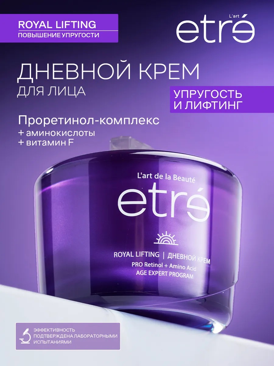 Дневной крем для лица etre ROYAL LIFTING Контроль возраста (Age EXPERT) создан специально для поддержания молодости и красоты зрелой кожи. Крем для дневного ухода с ниацинамидом, Про-ретинол комплексом, антиоксидантами, аминокислотами, витаминами и маслом ши эффективно борется с увяданием взрослой кожи, стимулируя клеточное обновление, снижает пигментацию, усиливает сияние и делает кожу более молодой и подтянутой.