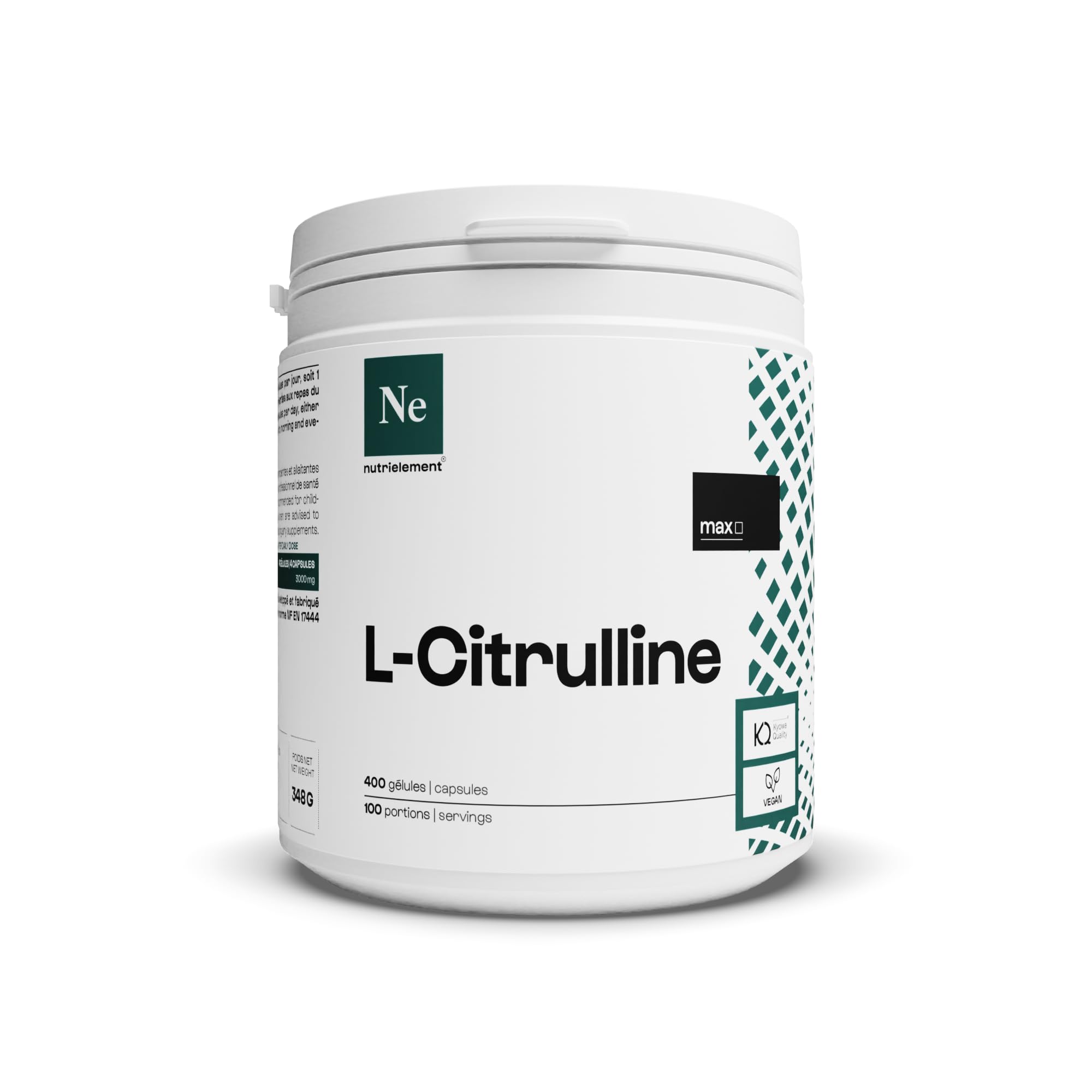 TRACEABILITY and TRANSPARENCY - L-Citrulline base is a form of pure L-citrulline. At Nutrielement, we only use very high-end L-citrulline whose quality is guaranteed by the Japanese leader in pharmaceutical biotechnology, BioKyowa Inc, certified HACCP and ISO9001. DOSAGE and ADVICE - Take 4 capsules per day, either 1 hour before physical activity, or spread over the morning and evening meals. Ideal for pre-workout, we recommend taking Nutrielement L-Citrulline with L-Arginine to maximize the secretion of NO. BENEFITS - Amino acid naturally produced by the body - Pure form - Produced by Biokyowa - Ideal for Pre-workout. PERFORMANCE BOOSTER - Citrulline is a non-essential amino acid, the body can produce it naturally. Nutrilement citrulline is a pure form, derived from a fermentation process from sugar. Citrulline is ideal for adding to your shaker with Beta-alanine and Arginine to make your pre-workout, to be taken before physical exertion. NEW NUTRIELEMENT RANGE - Leader in sports supplementation, Nutrimuscle is expanding its offering to include Nutrilement, a new range focused on active well-being. Nutrilement supports you in your quest for vitality and daily balance for a healthy lifestyle. The essential element is you.TRAÇABILITÉ et TRANSPARENCE - La L-Citrulline base est une forme de L-citrulline pure. Chez Nutrielement, nous n'utilisons que de la L-citrulline de très haut de gamme dont la qualité est garantie par le leader japonais en biotechnologie pharmaceutique, BioKyowa Inc, certifié HACCP et ISO9001 . DOSAGE et CONSEILS - Prendre 4 gélules par jour, soit 1 heure avant un effort physique, soit réparties au repas du matin et du soir. Idéal en pre workout, nous vous recommandons de prendre la L-Citrulline Nutrielement avec la L-Arginine pour augmenter au maximum la sécrétion de NO. BÉNÉFICES - Acide aminé naturellement produit par le corps - Forme pure - Produit par Biokyowa - Idéal en Preworkout. BOOSTER DE PERFORMANCE - La citrulline est un acide aminé non-essentiel, le corps peut la produire naturellement. La citrulline Nutrielement est une forme pure, issue d'un processus de fermentation à partir de sucre. La Citrulline est idéale à intégrer dans votre shaker avec de la Bêta-alanine et de l'Arginine pour confectionner votre préworkout, à prendre avant un effort physique. NOUVELLE GAMME NUTRIELEMENT - Leader de la complémentation sportive, Nutrimuscle élargit son offre pour inclure Nutrielement, une nouvelle gamme axée sur le bien-être actif. Nutrielement vous accompagne dans votre quête de vitalité et d'équilibre au quotidien pour un mode de vie sain. L'élément essentiel, c'est vous.
