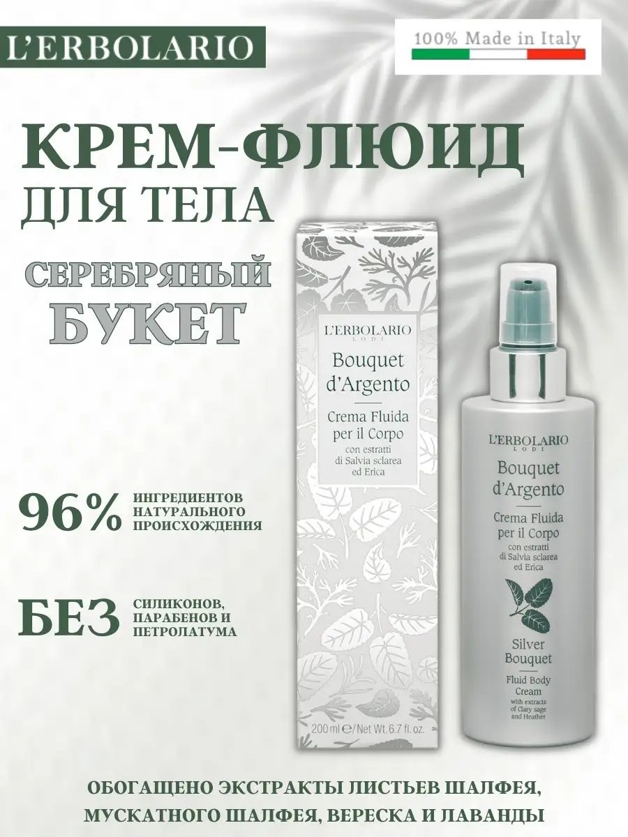Испытайте невероятное наслаждение от крем-флюида для тела L'Erbolario "Серебряный букет". Созданный на 96% из натуральных ингредиентов, этот изысканный крем-флюид не содержит силиконов, парабенов и петролатума. Окунитесь в атмосферу освежающих цитрусовых и ароматических запахов, а активные экстракты шалфея, лаванды и вереска гармонично питают, тонизируют и осветляют кожу. Инновационная смесь органических масел подсолнечника, какао и иллипа от L'Erbolario окутывает сиянием и красотой. Подарите своему телу заботу, которой оно заслуживает, с помощью L'Erbolario - воплощения природной элегантности и изысканности.