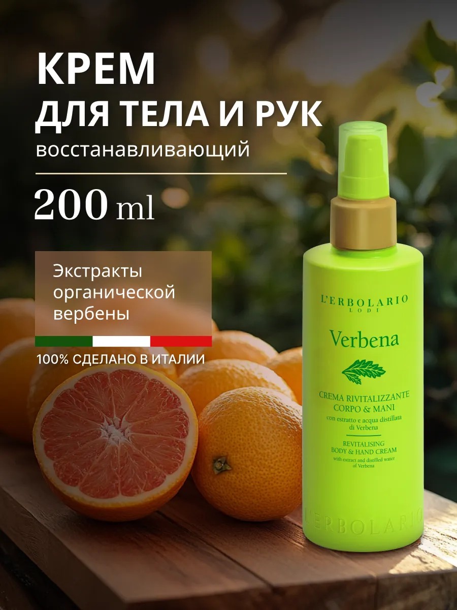 Восстанавливающий крем для тела и рук Verbena Revitalising Body & Hand Cream 200мл оказывает тонизирующее и освежающее действие благодаря экстрактам, полученным в лаборатории из органических листьев вербены и лимона. Масла органического подсолнечника, сливы и оливы оказывают интенсивное питательное действие. Увлажняет, тонизирует, освежает, питает. Этот парфюмированный крем с цитрусовыми и зелеными нотами - настоящее удовольствие для тела и рук. Тонизирующее и освежающее действие, которое оказывают экстракты, полученные в лаборатории из органических листьев вербены и лимона, дарят коже ощущение бодрости и хорошего самочувствия. Нанесите на кожу тела и рук массажными движениями. Подходит для всех типов кожи. Продукт на 100% произведен в Италии, не тестировался на животных и не содержит тяжелых металлов. Упаковка полностью сделана из экологичных материалов и подлежит переработке. 96% ингредиентов натурального происхождения. Без силиконов, парабенов и петролатума.