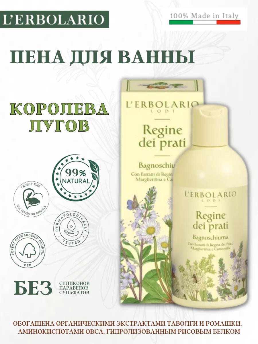 Гель-пена для ванны Королева лугов L'Erbolario - это цветочная рапсодия для вашей кожи. Каждое применение этого продукта станет настоящим путешествием по зеленым просторам, где в лучах солнца раскрываются маленькие цветы ромашки и королевы лугов. Аромат, наполненный нотами цветов и зелени, окутывает кожу, оставляя нежность и свежесть. Этот гель для ванны, состоящий на 95% из натуральных ингредиентов, обеспечивает активное увлажнение кожи, придавая ей упругость и свежесть. Органические экстракты цветов обладают антиоксидантными, тонизирующими и защитными свойствами, которые помогают сохранить молодость и здоровье вашей кожи.
