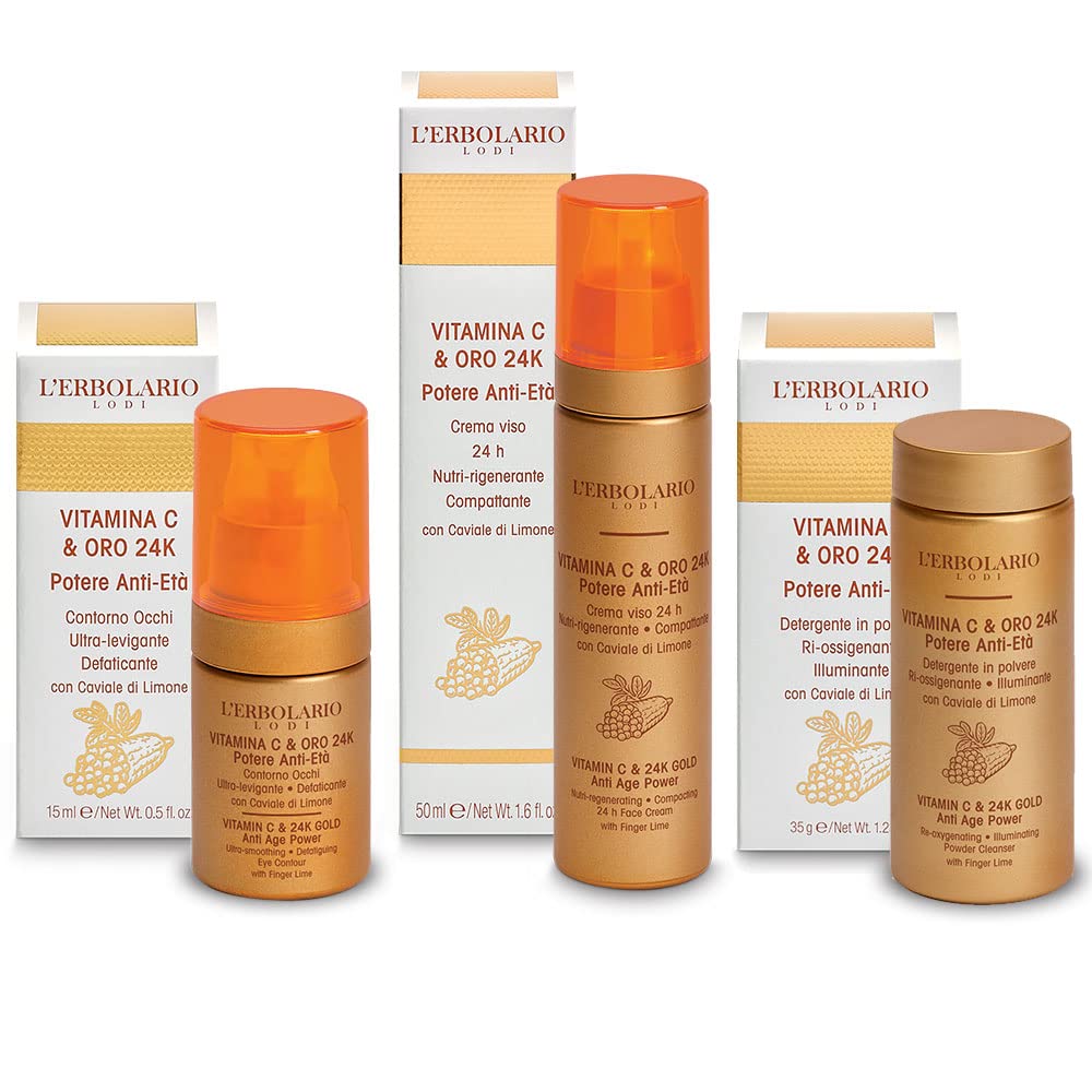 From the expertise of L'Erbolario laboratories, the new skincare line renews the beauty of your face thanks to a selection of cutting-edge active ingredients with anti-aging, antioxidant, and illuminating properties. A revolutionary powder cleanser that, upon contact with water, transforms into a delicate cleansing foam suitable for all skin types, even dry and sensitive. The effect is astonishing and immediate: from the first touch, skin appears brighter, smoother, firmer, and as if reoxygenated. Vitamin C and pure gold particles provide a brightening and smoothing action, enhanced by the presence of lemon caviar extract, lemon leaves, and lemon branches and leaves. Thanks to the innovative combination of vitamin C and 24-karat gold, this precious day and night cream delivers astonishing results: visibly reduced superficial wrinkles and immediately smoother, firmer, and more radiant skin. Pure gold particles effectively deliver vitamin C to the skin, enhancing its free radical scavenging and antioxidant properties. Ultrafiller hyaluronic acid works synergistically with lemon caviar extract and pink grapefruit juice, rich in vitamin C, for superior anti-aging benefits. Signs of aging and fatigue are visibly reduced thanks to this innovative treatment, which harnesses the power of pure gold to efficiently deliver vitamin C to the skin, thus reinforcing its antioxidant and anti-aging action. Furthermore, ultrafiller hyaluronic acid hydrates the periocular area and preserves collagen, while caffeine from green coffee beans promotes superficial microcirculation, thereby reducing puffiness and dark circles.Signs of aging and fatigue are visibly reduced thanks to this innovative treatment, which harnesses the power of pure gold to efficiently deliver vitamin C to the skin, thus enhancing its antioxidant and anti-aging effects. Furthermore, ultrafiller hyaluronic acid hydrates the periocular area and preserves collagen, while caffeine from green coffee beans promotes superficial microcirculation, thereby reducing puffiness and dark circles. The pure gold particles effectively deliver vitamin C to the skin, reinforcing its free radical scavenging and antioxidant functions. Ultrafiller hyaluronic acid works synergistically with superior anti-aging power, combined with lemon caviar extract and pink grapefruit juice, rich in vitamin C. Thanks to the innovative combination of vitamin C and 24-karat gold, this precious day and night cream delivers astonishing results: visibly reduced superficial wrinkles and immediately smoother, firmer, and more radiant skin. A revolutionary powder cleanser transforms into a delicate cleansing foam upon contact with water, suitable for all skin types, even dry and sensitive. The effect is astonishing and immediate: from the first touch, skin appears brighter, smoother, firmer, and as if reoxygenated. Vitamin C and pure gold particles provide a brightening and smoothing action, enhanced by the presence of lemon caviar extract, lemon leaves, and lemon branches and leaves. From the experience of L'Erbolario laboratories, the new skincare line that renews the beauty of your face thanks to a selection of cutting-edge active ingredients with anti-aging, antioxidant and illuminating power.L' Erbolario - Paquet Anti Age VITAMINE C et OR 24 carats - 1 crème pour le visage 24 h nettoyant en poudre 1 contour des yeux lissant en cadeau Savon végétal Florinda de 50 gDESCRIPTION DU PRODUIT De l'expérience des laboratoires L'Erbolario, la nouvelle ligne skincare qui renouvelle la beauté de votre visage grâce à une sélection d'actifs d'avant-garde au pouvoir anti-âge, antioxydant et illuminant. Un nettoyant révolutionnaire en poudre qui, au contact de l'eau, se transforme en une mousse lavante délicate adaptée à tous les types de peau, même sèches et sensibles. L'effet est étonnant et immédiat : dès la main, la peau apparaît plus lumineuse, lisse, compacte, comme réoxygénée. La vitamine C et les particules d'or pur offrent en effet une action éclaircissante et lissante, renforcée par la présence des extraits de caviar de citron, feuilles de citron, branches et feuilles de citron. Grâce à la liaison innovante de vitamine C et d'or 24 carats, cette précieuse crème jour et nuit offre un résultat étonnant : rides superficielles visiblement atténuées et peau immédiatement plus lisse, compacte, lumineuse. Les particules d'or pur ont en effet le pouvoir de véhiculer efficacement au niveau de la peau la vitamine C, en renforçant sa fonction antiradicalique et antioxydante. L'acide hyaluronique ultrafiller s'activent en synergie au pouvoir supérieur et anti-âge, l'extrait de cavial de citron et le jus de pamplemousse rose, riche en vitamine C. Les signes d'expression et les traces de fatigue s'atténuent visiblement grâce à ce traitement innovant, qui exploite le pouvoir de l'or pur de véhiculer efficacement au niveau cutané la vitamine C, renforçant ainsi l'action antioxydante et anti-âge. De plus, l'acide hyaluronique ultrafiller hydrate la zone périoculaire et préserve le collagène, tandis que la caféine à graines de café vert favorise la microcirculation superficielle cutanée en atténuant ainsi les poches et les cernes.Les signes d'expression et les traces de fatigue s'atténuent visiblement grâce à ce traitement innovant, qui exploite le pouvoir de l'or pur de véhiculer efficacement au niveau cutané la vitamine C, renforçant ainsi l'action antioxydante et anti-âge. De plus, l'acide hyaluronique ultrafiller hydrate la zone périoculaire et préserve le collagène, tandis que la caféine à graines de café vert favorise la microcirculation superficielle cutanée en atténuant ainsi les poches et les cernes. Les particules d'or pur ont en effet le pouvoir de véhiculer efficacement au niveau de la peau la vitamine C, en renforçant sa fonction antiradicalique et antioxydante. L'acide hyaluronique ultrafiller s'activent en synergie