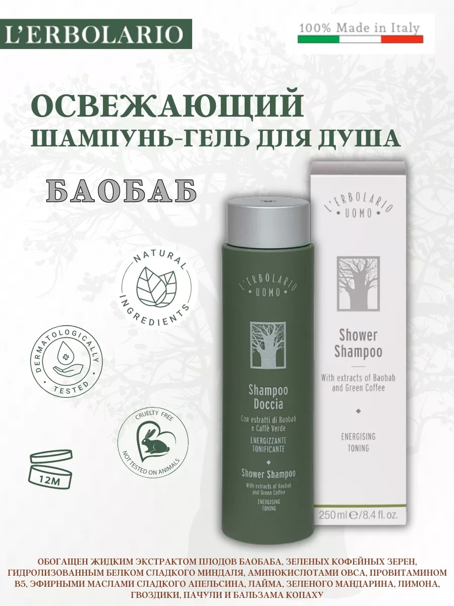 | Комплектация | L'Erbolario Шампунь-гель для душа для мужчин линии БАОБАБ, 250 мл |