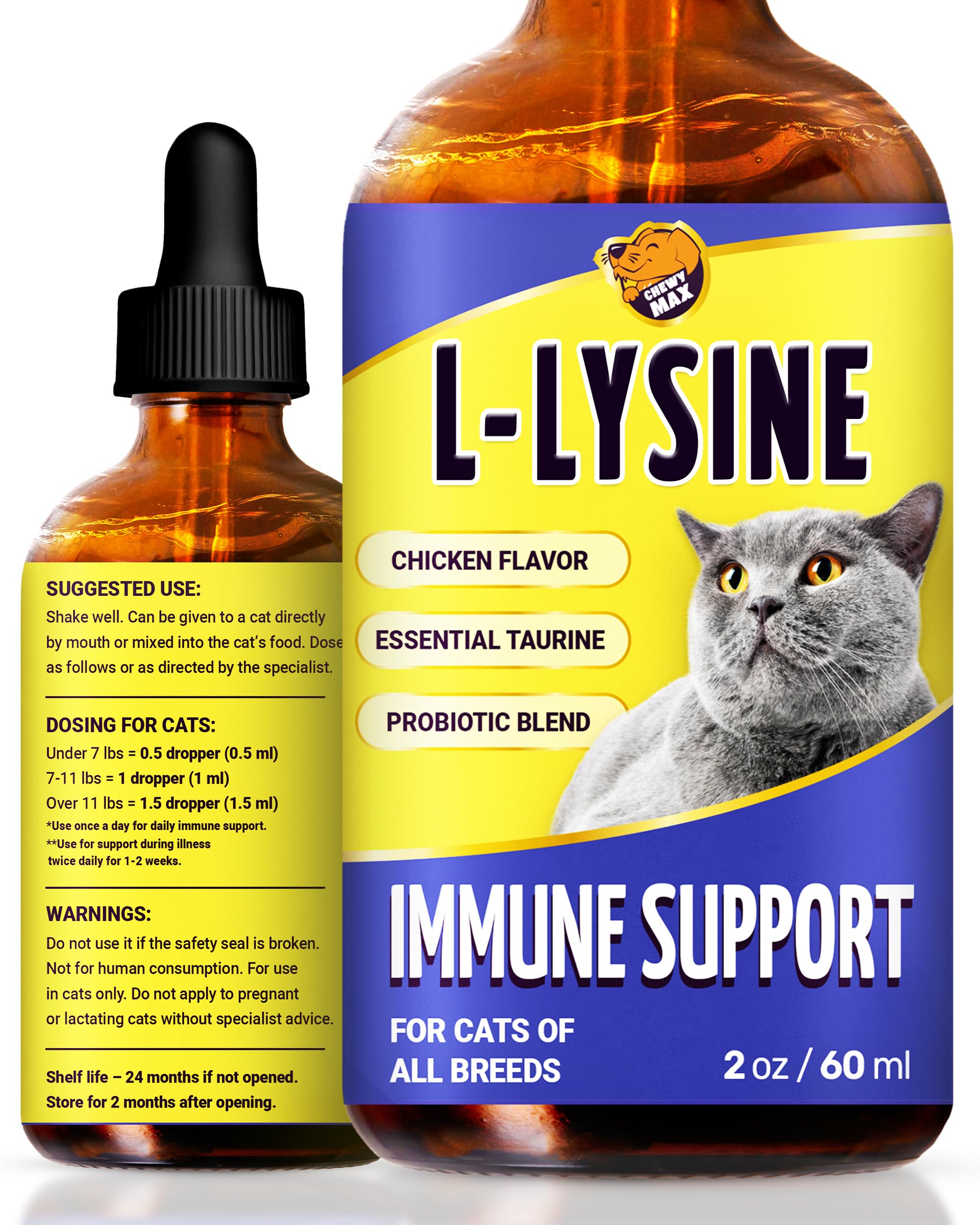 CUSTOMER CARE: Our mission is to make your cat's life easier. That's why we're always here to help. If you have any questions, please don't hesitate to contact us. We will be happy to assist you. MAIN BENEFITS: L-Lysine is free from artificial colorants and additives. It includes cat vitamins and supplements. Only safe components with natural Chicken Flavor for cat respiratory infection treatment. LIQUID FORM: Our L-Lysine drops for cats are formulated for quick absorption. Since cats don't produce L-Lysine by themselves, simply add it to their food or directly into their mouth. SAFE INGREDIENTS: We made a cat Lysine supplement with effective ingredients, including L-Lysine HCl, Taurine, Vitamin A, B1, B2, B6, Biotin, Zinc, Astragalus Extract, Echinacea Extract, and others. COMPREHENSIVE HELP: L-Lysine works as antibiotics for cats, providing support for breathing, digestive metabolism regulation. Cat supplements facilitate skin coat condition make your pet active. L-LYSINE FOR CATS: Our L-Lysine supplement for cats perfectly helps with cough, runny nose, and sneezing. Vitamin A is especially effective for watery eyes and helps prevent irritation in your cat.