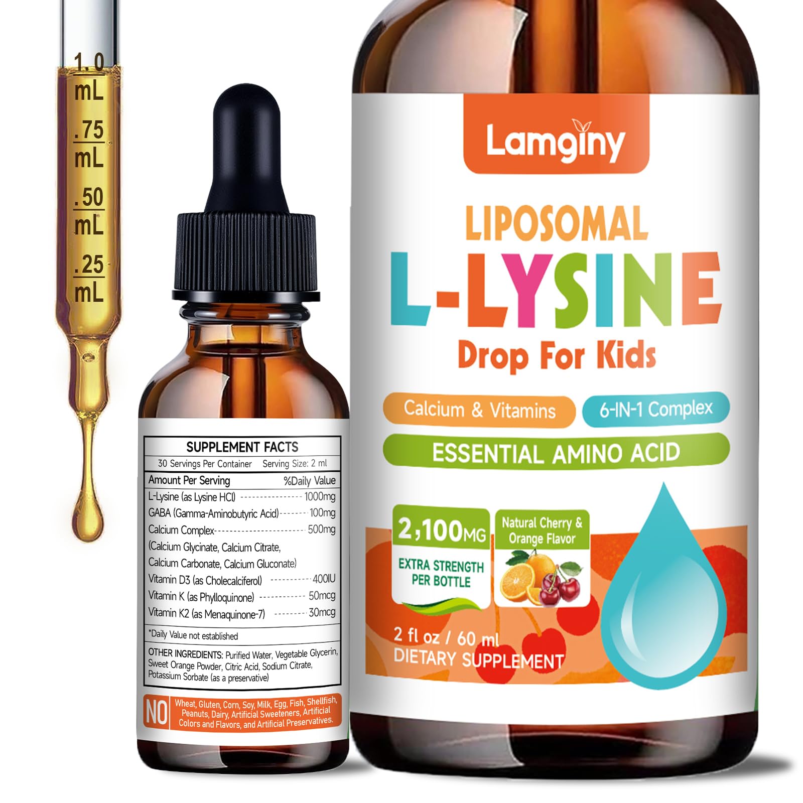 Trustworthy: Our L-Lysine for kids drops are manufactured in a GMP-certified facility, and each batch undergoes third-party purity and potency testing. They are non-GMO, soy-free, gluten-free, and vegan-friendly. As a reliable l-lysine liquid supplement for kids, we are committed to making quality products to ensure your child can consume them with peace of mind. Liposome-Based Rapid Absorption Formula: We utilize advanced liposome technology, and unlike capsules or tablets that are difficult to swallow, our liquid form allows for faster absorption and higher bioavailability. Our children's lysine, specially formulated for l-lysine for kids cold sores, significantly enhances calcium absorption and provides targeted support for lips and oral health. Delicious Cherry Orange Blend Flavor Kids Love: Our unique, naturally flavored cherry orange blend is irresistible. Simply mix the measured 2mL serving of liquid lysine into water, juice, or your child's favorite beverage for a delicious daily dose of immune, skin, lip, and oral health support, making it an ideal l-lysine for kids option. 6-In-1 High-Efficiency Formula: Our unique 1000mg L-Lysine drops for kids blend contains a multi-source calcium complex to support bone and development, vitamin D3 to promote calcium absorption, vitamins K and K2 to promote calcium utilization, and GABA to improve focus. This complex blend is designed to work synergistically with essential l-lysine liquid to effectively promote children's development. Specially Formulated for Children: Our L-Lysine for kids drops contain 1000mg of pure lysine per serving. They are specially formulated to enhance immune function, promote skin health, boost collagen synthesis, enhance calcium absorption, and prevent disease. As a trusted L-Lysine supplement, they are free of artificial colors, flavors, and added sugars — ideal for children.