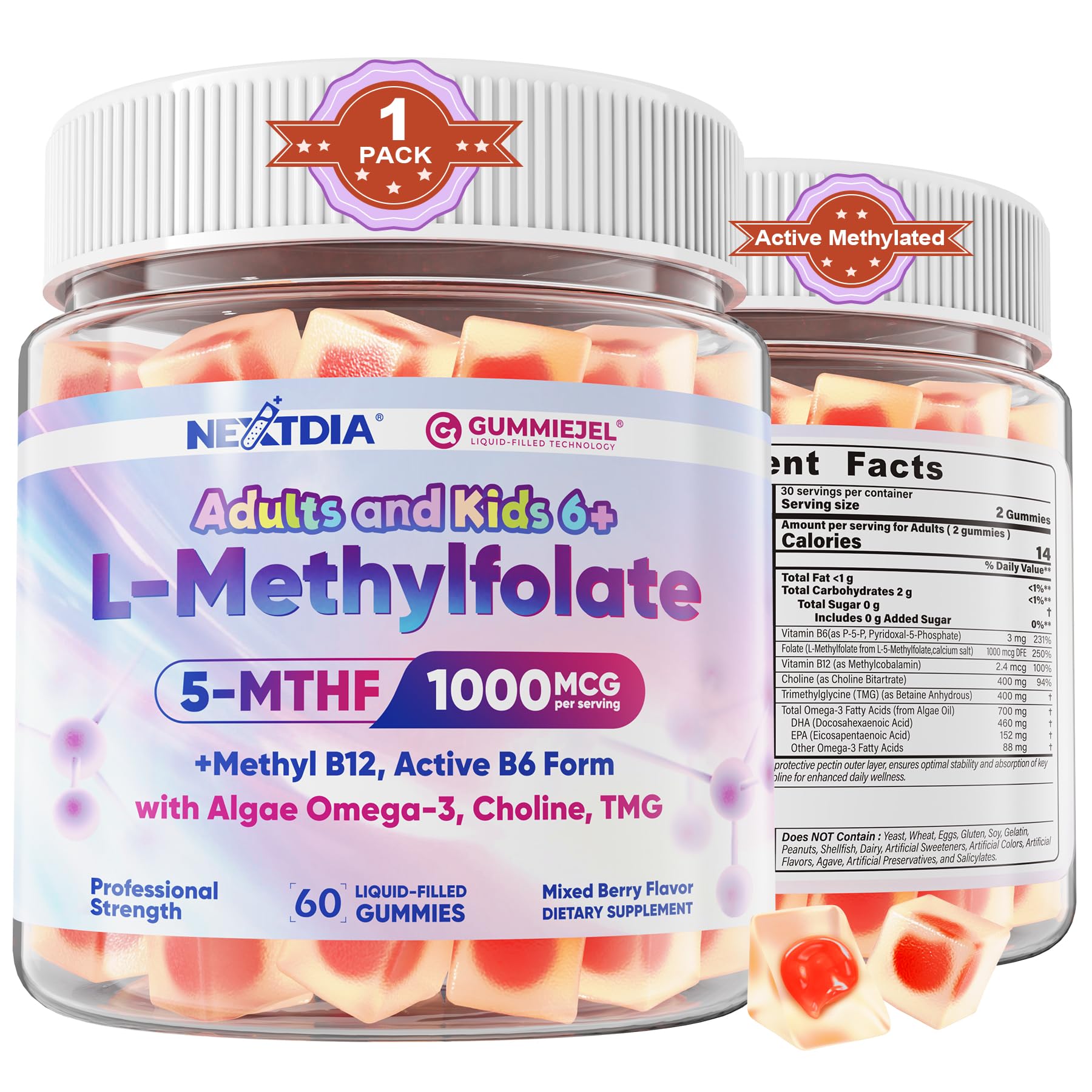 ADVANCED GUMMIEJEL TECHNOLOGY: Our Methylfolate 1000mcg 500mcg liquid-filled Gummies utilize advanced GummieJel technology a dual-layer design that locks methyl folate, methylated B12, B6 and other nutrients in the center. A pectin-based outer layer protects the inner ingredients from oxidation, providing greater stability and improved absorption. Our 5 mthf supplement are not only effective but also delicious, making it easier for both kids and adults to enjoy their daily dose of active folate!. HEA?T HEALTH SUSTAINED ENERGY FOUNDATION: Our formula combines L-Methylfolate, TMG, Choline, and methylated b complex to promote healthy hom?cyst?ine metab?lism and keep your hea?t in top shape. This methyl folate supplement helps convert food into steady cellular energy, so you and your child feel energized and refreshed throughout the day—whether at school, work, or play. Protect your hea?t health and enjoy natural energy with this bioavailable methylated folate formula!. BRAIN COGNITIVE SUPPORT WITH L-METHYLFOLATE PURE ALGAL DHA: Give your child's developing brain and your own cognitive function a boost with L-Methylfolate, paired with Omega3 from vegan algae oil in a 3:1 DHA to EPA ratio. This DHA-rich blend works with L-Methylfolate to nourish your brain, support focus and enhance memory. Whether you're a student, busy professional or senior, this Methylfolate supplement promotes m?ntal clarity, boosts cognitive performance and keeps your brain sharp. TRIPLE ACTION BOOST: Our unique L-Methylfolate, in synergy with Methyl vitamins B12 and B6, regulates hom?cyst?ine levels in the bl d to maintain its ideal levels, helping to boost energy, soothing feelings. These "body-ready" nutrients are ideal for those with MTHFR concerns, requiring no conversion for immediate use and superior bioavailability. What's more, 5 MTHF also supports your brain clarity, focus, cognitive function and circulatory health. A triple potency boost your body will love!. ACTIVE FORM OF FOLATE FOR ALL AGES: Did you know 50-60 of the U.S. population struggles to convert folic acid into its active form, 5-MTHF? Our L-Methylfolate gummies provide 1000 mcg of 5-MTHF, the bioactive form that crosses the bl d-brain barrier for maximum absorption—no conversion needed! Paired with Methyl B12, B6 and unique addition of Omega-3, TMG and Choline, delivering 7x more methylation than standard B9, to boost energy, focus and wellness—perfect for kids, adults and families!.