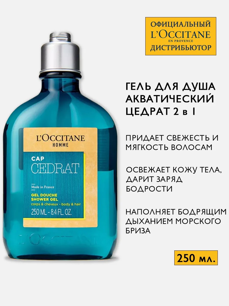 Aquatic Cedrate Moisturizing Shower Gel. Enriched with cedrate essential oil, it cleanses the skin, imparting a fresh, marine scent. A blend of bright citrus notes, accented with an intriguing woody-cedar note of spices. The citrus fragrance instantly provides a boost of energy for a dynamic and active day. Natural ingredients. Preserves youth and beauty. L'occitane's professional cleanser is presented in a compact format. It provides a refreshing effect in the morning and a soothing effect in the evening. This fragrant, nourishing shower gel is designed for men. This care product gently removes impurities. The skin becomes fresh and hydrated. It deeply nourishes and hydrates cells, leaving a velvety, soft feel. The luxurious, thick foam will transform your shower into a true spa experience. This scented product is suitable for all skin types, including sensitive and very dry skin. Directions for use: Apply a small amount, lather, then rinse. Enjoy L'Occitane's unique perfumed cosmetics right now, which will give you powerful energy.