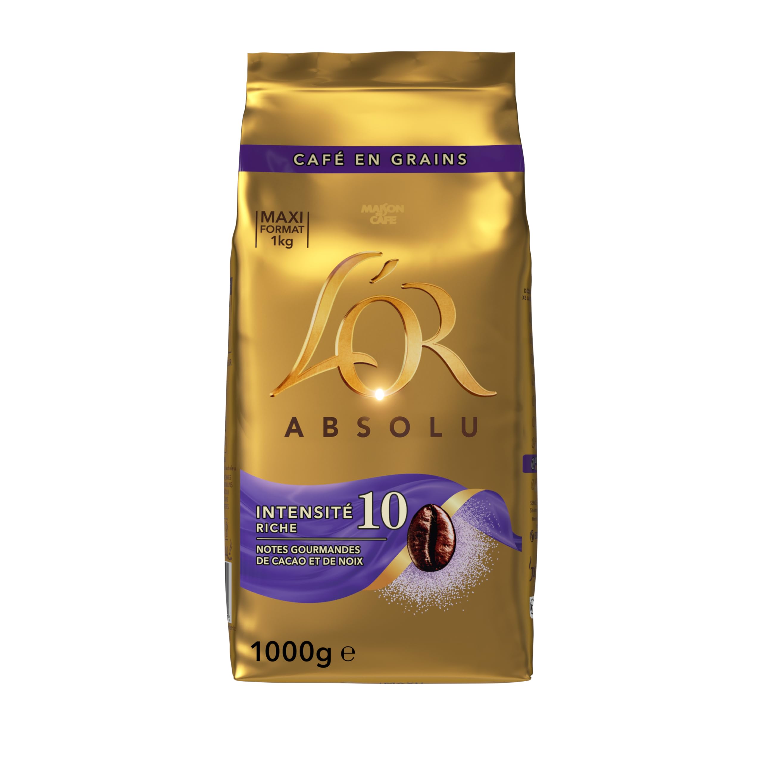 : Since its inception, L'OR has strived to offer a unique experience. L'OR beans are carefully selected by L'OR Master Roasters for an authentic and elegant experience. L'OR Grains Absolu coffee is a blend of carefully selected Arabica and Robusta beans, revealing powerful aromas enhanced by rich notes of cocoa and nuts. Certified Common Ground, L'OR is committed to producing coffee that is both flavorful and environmentally responsible. 1 kg of coffee beans yields an average of 142 cups of coffee, using 7 g of beans per cup. L'OR coffee beans are perfect for automatic machines with a built-in grinder or for use with an electric grinder. Once ground, this coffee can be used in any type of coffee maker, whether espresso, Moka pot, filter, or French press. Ingredients: Roasted coffee beans. P.when('A').execute(function(A) { A.on('a:expander:toggle_description:toggle:collapse', function(data) { window.scroll(0, data.expander. expander[0].offsetTop-100) }) }) Instructions for use: Use in automatic machines or bean grinders. Once ground, it can be used in all types of coffee makers. Safety Warning: store in a dry place away from heat and light. Packaged in a protective atmosphere. See moreCompatible with all automatic bean-to-cup machines and grinders. Packaged in a protective atmosphere with a freshness valve to ensure optimal preservation of your coffee's aroma. A blend of Arabica and Robusta coffee beans for a full-bodied and lingering coffee experience. L'OR Absolu whole bean coffee is available in a 1kg bag. L'OR Absolu coffee beans, intensity 10, for an exquisite coffee with notes of cocoa and nuts. L'OR, 1kg Whole Bean Coffee Absolu, Arabica Robusta, Intensity 10.Description du produit L'OR a depuis sa création l'ambition d'offrir une expérience unique. Les grains L'OR sont sélectionnés avec soin par les Maîtres Torréfacteurs L'OR, pour une expérience authentique et élégante. Le café L'OR Grains Absolu est issu d'un assemblage de grains de café Arabica Robusta soigneusement sélectionnés pour révéler des arômes puissants, sublimés par des notes gourmandes de cacao et de noix. Certifié Common Grounds, L'OR œuvre pour un café à la fois savoureux et respectueux de l'environnement. 1kg de grains de café permettent de produire en moyenne 142 tasses de café en utilisant 7g de grains par tasse. Les grains de café L'Or sont parfaits pour une machine automatique équipée d'un broyeur ou pour un moulin électrique. Une fois moulu, vous pourrez utiliser ce café dans n'importe quel type de cafetière, que ce soit à expresso, à l'Italienne, à filtre ou à piston. Ingrédients Cafés en grains torréfiés P.when('A').execute(function(A) { A.on('a:expander:toggle_description:toggle:collapse', function(data) { window.scroll(0, data.expander. expander[0].offsetTop-100) }) }) Mode d'emploi A utiliser dans des machines automatiques ou des moulins à grains. Une fois moulu, il peut être utilisé dans tous types de cafetières. Avertissement De Sûreté A conserver au sec et à l'abri de la chaleur et de la lumière. Conditionné sous atmosphère protectrice. Voir plusCompatible avec toutes les machines à grains automatiques et les moulins à grain. Conditionnement sous atmosphère protectrice avec une valve fraicheur garantissant une préservation optimale des arômes de votre café. Assemblage de grains de café Arabica et Robusta pour une expérience de café corsée et longue en bouche. L'OR Absolu en grains vous est proposé dans un sachet de 1kg. Grains de café L'OR Absolu d'intensité 10 pour un café exquis aux notes de cacao et de noix. L'OR, 1Kg Café en Grains Absolu, Arabica Robusta, Intensité 10.L'OR, 1Kg Café en Grains Absolu, Arabica Robusta, Intensité 10 1 kg (Lot de 1)