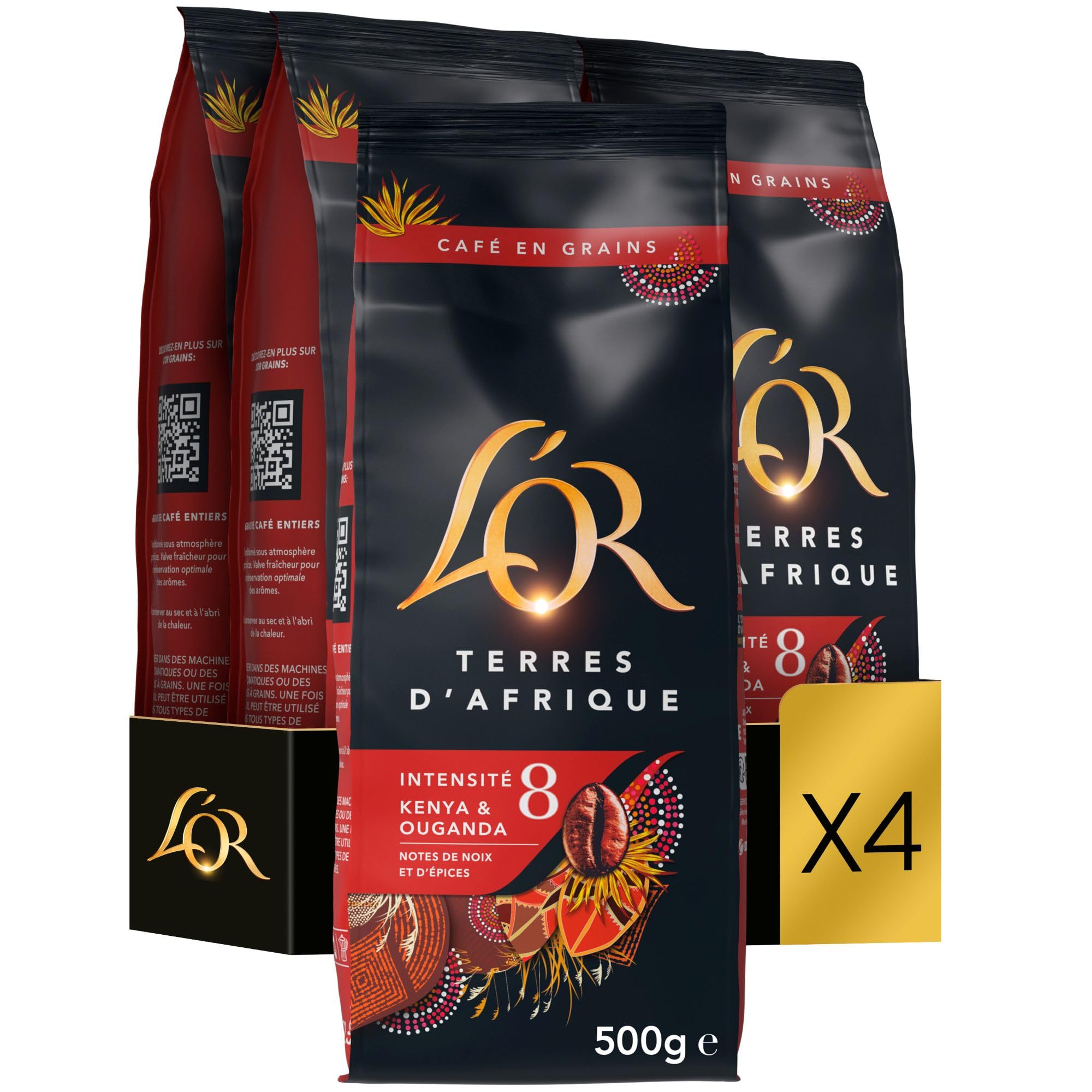 : L'OR has always strived to offer an unparalleled experience. Our Master Roasters select beans from the prestigious terroirs of Kenya and Uganda. Terres d'Afrique reveals a 100 Arabica coffee with intense flavors: a powerful body, vegetal, spicy, and fruity notes highlighted by expertly roasted coffee. The intensity level of 8 ensures a deep and expressive tasting experience. This 2kg pack (4 x 500g bags) is ideal for optimal preservation and consistent quality. Certified Common Grounds, it embodies L'OR's commitment to sustainable and ethical production. On average, 500g of beans yields approximately 70 cups (at 7g per cup), or 280 cups for the entire pack. Compatible with automatic machines or traditional grinders, these beans can be used in all types of coffee makers: espresso, moka pot, filter, or French press. Ingredients: Roasted coffee beans. P.when('A').execute(function(A) { A.on('a:expander:toggle_description:toggle:collapse', function(data) { window.scroll(0, data.expander. expander[0].offsetTop-100) }) }) Safety Warning: store coffee beans away from moisture and heat, in the original packaging or in an airtight container. See moreA responsibly sourced coffee, part of the JDE Peet's Common Grounds initiative: a program working towards a better future where farmers and nature thrive. High-quality packaging – airtight bags to preserve the aroma and freshness of the beans until consumption. L'OR guarantees optimal preservation of its aroma. Compatible with all automatic bean-to-cup machines and grinders. Generous 2kg format (4 x 500g) – perfect for regular consumption, at home or in the office. A powerful and structured taste – 100 Arabica coffee with an intensity of 8, sourced from Kenya and Uganda, with a pronounced intensity and deep, spicy, and fruity aromas.Description du produit L'OR, depuis toujours, souhaite offrir une expérience incomparable. Les Maîtres Torréfacteurs sélectionnent des grains provenant des terroirs prestigieux du Kenya et de l'Ouganda. Terres d'Afrique révèle un café 100 Arabica aux saveurs intenses : corps puissant, notes végétales, épicées et fruitées soulignées par une torréfaction maîtrisée. L'intensité 8 assure une dégustation profonde et expressive. Ce lot de 2kg (4 sachets de 500g) est idéal pour une conservation optimale et une qualité constante. Certifié Common Grounds, il incarne l'engagement de L'OR envers une production durable et solidaire. En moyenne, 500g de grains produisent environ 70 tasses (avec 7g par tasse), soit 280tasses pour l'ensemble du pack. Compatible avec les machines automatiques ou moulins traditionnels, ces grains peuvent être utilisés dans toutes les cafetières : espresso, italienne, filtre ou piston. Ingrédients Cafés en grains torréfiés P.when('A').execute(function(A) { A.on('a:expander:toggle_description:toggle:collapse', function(data) { window.scroll(0, data.expander. expander[0].offsetTop-100) }) }) Avertissement De Sûreté Conserver les grains de café à l'abri de l'humidité et de la chaleur, dans l'emballage d'origine ou dans un récipient hermétique. Voir plusUn café issu d'un approvisionnement responsable dans le cadre de la démarche JDE Peet's Common Grounds : un programme œuvrant à la création d'un avenir meilleur où les agriculteurs et la nature prospèrent. Conditionnement de qualité – emballage hermétique en sachets pour préserver les arômes et la fraîcheur des grains jusqu'à consommation L'OR vous garantit une préservation optimale de ses arômes. Compatible avec toutes les machines à grains automatiques et les moulins à grain. Format généreux de 2kg (4×500g) – parfait pour une consommation régulière, à la maison ou au bureau. Goût puissant structuré – café 100 Arabica d'intensité 8, issu du Kenya et de l'Ouganda, avec une intensité marquée et des arômes profonds, épicés et fruités.L'OR, 2 kg Café en Grains, Terres d'Afrique, Kenya et Ouganda, Intensité 8, 4 x 500 g