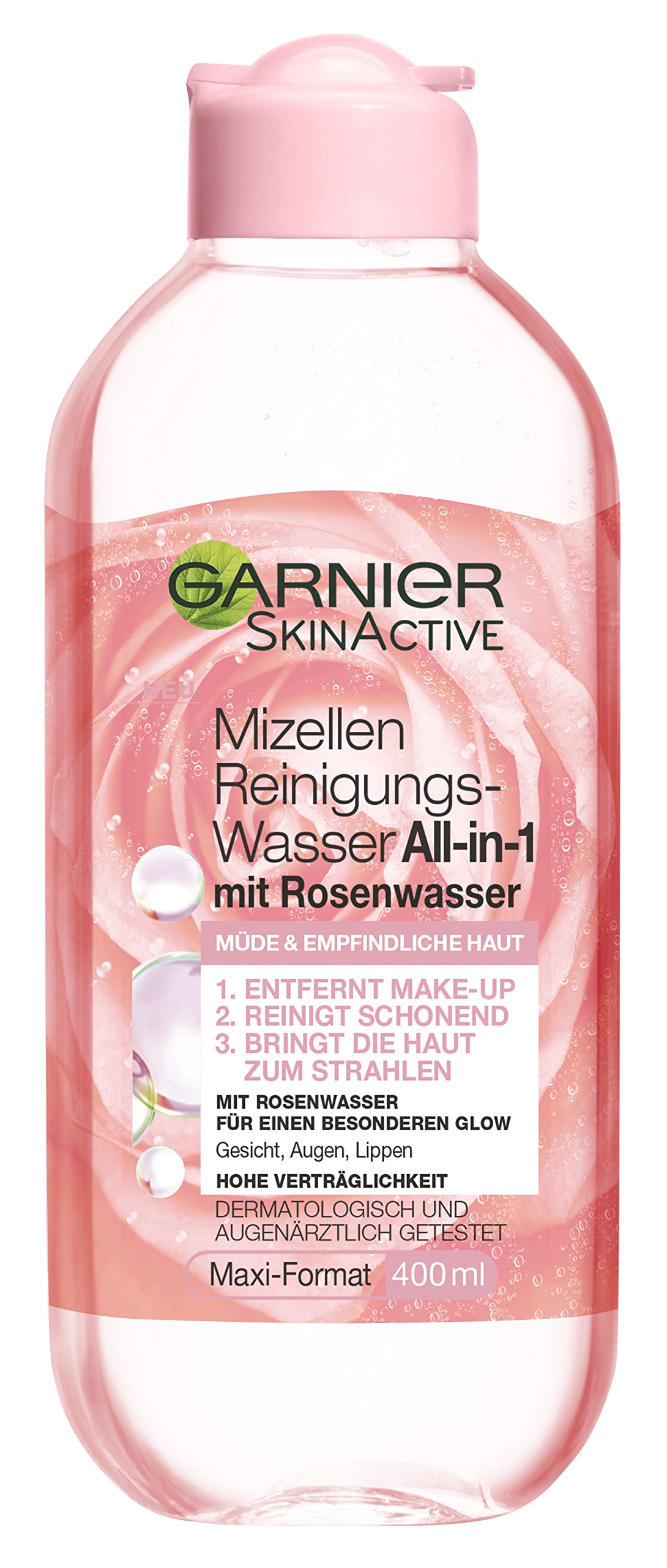 Unbeatable cleanser for the face: the micellar cleansing water All-in-1 with rose water is a real all-rounder when it comes to removing make-up and impurities from the skin effectively and gently. The formula with micellar cleansing technology and rose water attracts makeup like a magnet and gives tired skin a fresh, radiant complexion. Without rubbing or rinsing. Sensitive skin areas are soothed and the skin is hydrated. Due to its high tolerance, the cleansing water is particularly suitable for use on the face, eyes and lips. It is suitable for all skin types and is dermatologically and ophthalmologist tested. Gentle cleaning with just one application. INSTRUCTIONS FOR USE With the Garnier SkinActive Micellar Cleansing Water All-in-1 with rose water you can quickly, effectively and gently rid your skin of make-up and impurities. Use the cleansing product in the morning and evening. To do this, moisten a cotton pad sufficiently with the cleaning fluid and use it to clean your face, eyes and lips. To better dissolve the make-up, you can also briefly place the damp cotton pad on the sensitive areas of the skin. Thanks to the effective formula with micelles, no further rubbing or rinsing is necessary.Contents: 1 x Garnier Skin Active Micellar cleansing water All-in-1 with rose water, contents: 400 ml. Recyclable bottle contains 20 recycled plastic, high tolerance for face, eyes and lips, dermatologically and ophthalmologist tested. Use: Apply the cleanser to a cotton pad in the morning and evening and gently rub over the face, eyes and lips, no rubbing or rinsing necessary. Result: calming, hydrated skin, purified and refined skin image, radiant complexion, ideally prepared skin for the next facial cream. Cleansing facial water with micellar cleansing technology and rose water for tired, sensitive skin, to remove waterproof make-up and dirt.Garnier All-in-1 Micellair reinigingswater met rozenwater voor een speciale glow, make-up remover en gezichtsreiniging voor de gevoelige huid, Skin Active, 1 x 400 ml Onverslaanbare reiniger voor het gezicht: het micellaire reinigingswater All-in-1 met rozenwater is een echte alleskunner als het gaat om het verwijderen van make-up en onzuiverheden van de huid effectief en voorzichtig van make-up. De formule met micellaire reinigingstechnologie en rozenwater trekt make-up aan als een magneet en geeft een vermoeide huid een frisse, stralende teint. Zonder wrijven of afspoelen. Gevoelige huiddelen worden gekalmeerd en de huid wordt gehydrateerd. Door de hoge verdraagzaamheid is het reinigingswater bijzonder geschikt voor gebruik op gezicht, ogen en lippen. Het is geschikt voor alle huidtypes en is dermatologisch en door oogartsen getest. Zachte reiniging met slechts één toepassing. GEBRUIKSAANWIJZING Met het Garnier SkinActive Micellair reinigingswater All-in-1 met rozenwater kun je je huid snel, effectief en voorzichtig van make-up en onzuiverheden bevrijden. Gebruik het reinigingsproduct 's ochtends en 's avonds. Bevochtig hiervoor een wattenschijfje voldoende met de reinigingsvloeistof en reinig daarmee je gezicht, ogen en lippen. Om de make-up beter op te lossen, kun je het vochtige wattenschijfje ook kort op de gevoelige delen van de huid leggen. Dankzij de effectieve formule met micellen is geen verder wrijven of afspoelen meer nodig.Inhoud: 1 x Garnier Skin Active Micellair reinigingswater All-in-1 met rozenwater, inhoud: 400 ml. Recyclebare fles bevat 20 gerecycled plastic, hoge verdraagzaamheid voor gezicht, ogen en lippen dermatologisch en door oogartsen getest. Gebruik: 's ochtends en 's avonds de reiniger op een wattenschijfje aanbrengen en zachtjes over het gezicht, ogen en lippen wrijven, wrijven of afspoelen niet nodig. Resultaat: kalmerende, gehydrateerde huid, gezuiverd en verfijnd huidbeeld, stralende teint, ideaal voorbereide huid voor volgende gezichtscrème. Reinigend gezichtswater met micellaire reinigingstechnologie en rozenwater voor vermoeide, gevoelige huid, voor het verwijderen van waterdichte make-up en vuil.