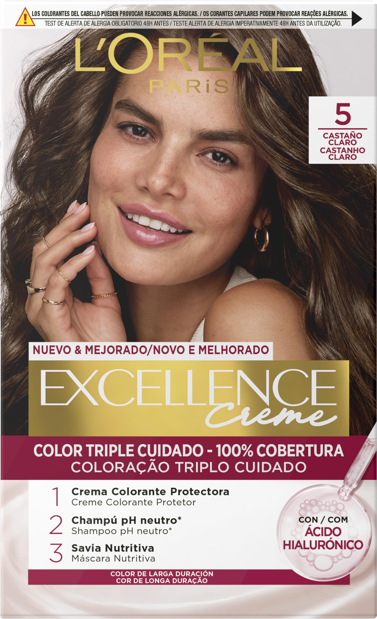 : Excellence Triple Care Cream ensures 100 gray coverage by caring for your hair at every stage of the coloring process. In just 3 steps, you achieve rich, long-lasting color. Ingredients: Unknown. P.when('A').execute(function(A) { A.on('a:expander:toggle_description:toggle:collapse', function(data) { window.scroll(0, data.expander. expander[0].offsetTop-100) }) }) Directions: Mix the color cream and developer, apply the mixture to your hair, leave it on for a while, then rinse. See moreContents - 60 ml. Ref. - 913-65045. Brand - L'Oréal.Description du produit Excellence Crème Triple Soin assure une couverture 100 des cheveux blancs en prenant soin de vos cheveux à chaque étape de la coloration. En seulement 3 étapes, vous obtenez une couleur riche et durable. Ingrédients Inconnu P.when('A').execute(function(A) { A.on('a:expander:toggle_description:toggle:collapse', function(data) { window.scroll(0, data.expander. expander[0].offsetTop-100) }) }) Mode d'emploi Mélangez la crème colorante et le développeur, appliquez le mélange sur vos cheveux, laissez agir un certain temps, puis rincez. Voir plusContenu - 60 ml. Réf. - 913-65045. Marque - L'Oréal.L'Oréal Excellence Crème Coloration pour Cheveux 5 60 ml
