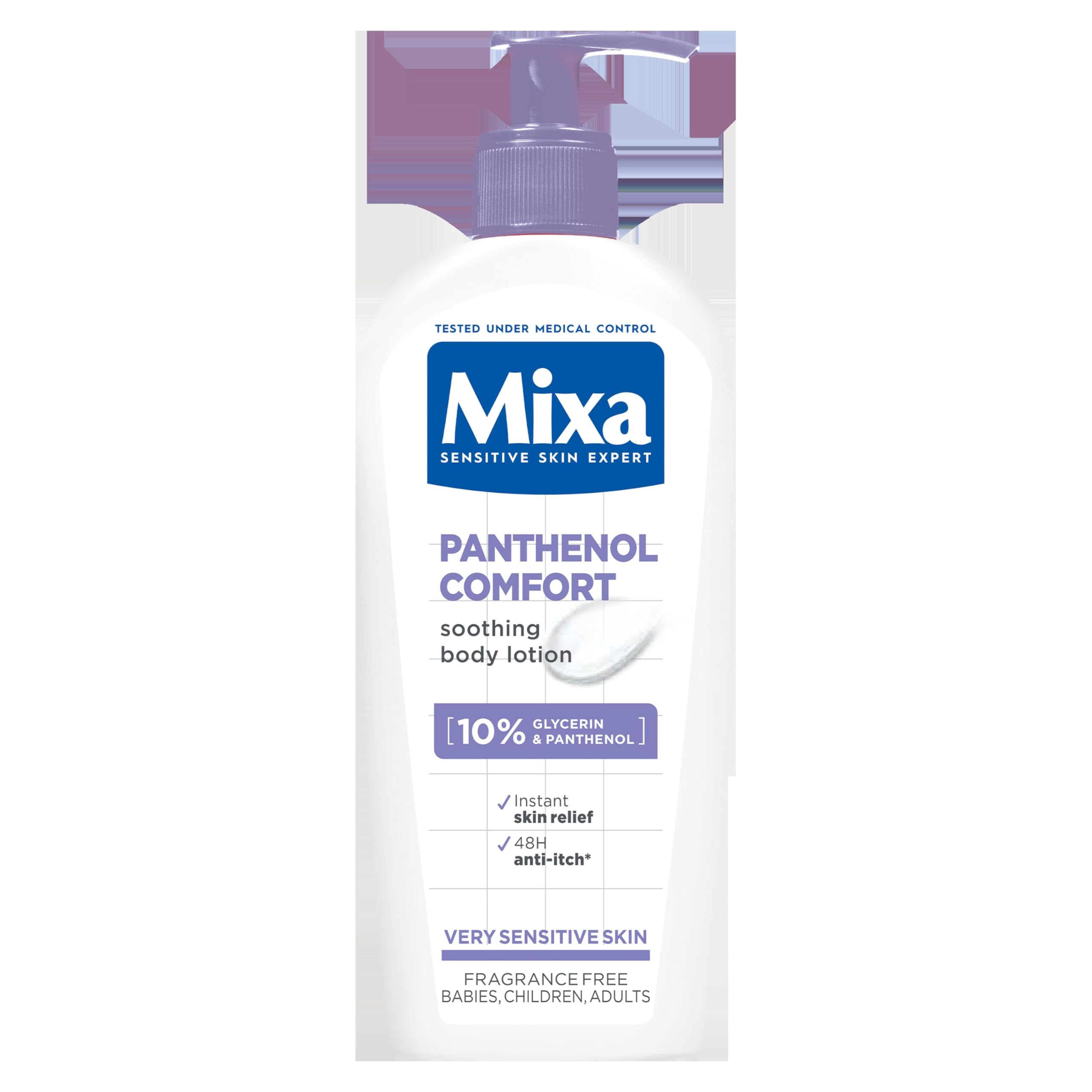 The Mixa Panthenol Comfort Body Lotion offers a soothing solution for dry and eczema-prone skin that often suffers from itching. The formula, enriched with 10 [GLYCERIN PANTHENOL] reduces dryness and leaves the skin feeling more comfortable. Glycerin helps with this thanks to its moisturizing properties, while Panthenol soothes and helps the skin recover. The lotion is clinically proven to reduce itching by 88 after use . The non-greasy texture is quickly absorbed and provides immediate relief to the skin. The Panthenol Comfort body lotion is formulated hypoallergenic, perfume-free and tested under medical supervision. This way we know for sure that it is suitable for sensitive skin. The product can be used as a caring lotion for the whole family and is therefore also suitable for babies and children. Consumer test, 61 people, 48 hours after 4 weeks of use. Clinical test, 41 people, after 4 weeks of use. SAFETY WARNING In case of contact with eyes, rinse immediately and thoroughly.Tested under medical supervision on sensitive skin. Absorbs quickly and does not feel greasy. Reduces dry skin and itching. Enriched with 10 [GLYCERIN PANTHENOL]. Soothing body lotion for eczema-prone skin.Mixa Panthenol Comfort kalmerende bodylotion - 250ml De Mixa Panthenol Comfort Bodylotion biedt een verzachtende oplossing voor een droge en eczeemgevoelige huid die vaak last heeft van jeuk. De formule, verrijkt met 10 [GLYCERINE PANTHENOL] vermindert droogheid en laat de huid comfortabeler aanvoelen. Glycerine helpt daarbij dankzij zijn hydraterende eigenschappen, terwijl Panthenol de huid kalmeert en helpt herstellen. De lotion is klinisch bewezen effectief in het verminderen van jeuk met 88 na gebruik . De niet-vette textuur trekt snel in en zorgt voor een directe verlichting van de huid. De Panthenol Comfort bodylotion is hypoallergeen geformuleerd, parfumvrij en getest onder medische controle. Zo weten we zeker dat het geschikt is voor een gevoelige huid. Het product kan gebruikt worden als verzorgende lotion voor het hele gezin en is dus ook geschikt voor babies en kinderen. Consumententest, 61 personen, 48 uur na 4 weken gebruik. Klinische test, 41 personen, na 4 weken gebruik. VEILIGHEIDSWAARSCHUWING Bij contact met de ogen onmiddellijk en overvloedig spoelen.Getest onder medische controle op een gevoelige huid. Trekt snel in en voelt niet vet aan. Vermindert een droge huid en jeuk. Verrijkt met 10 [GLYCERINE PANTHENOL]. Kalmerende bodylotion voor een eczeemgevoelige huid.