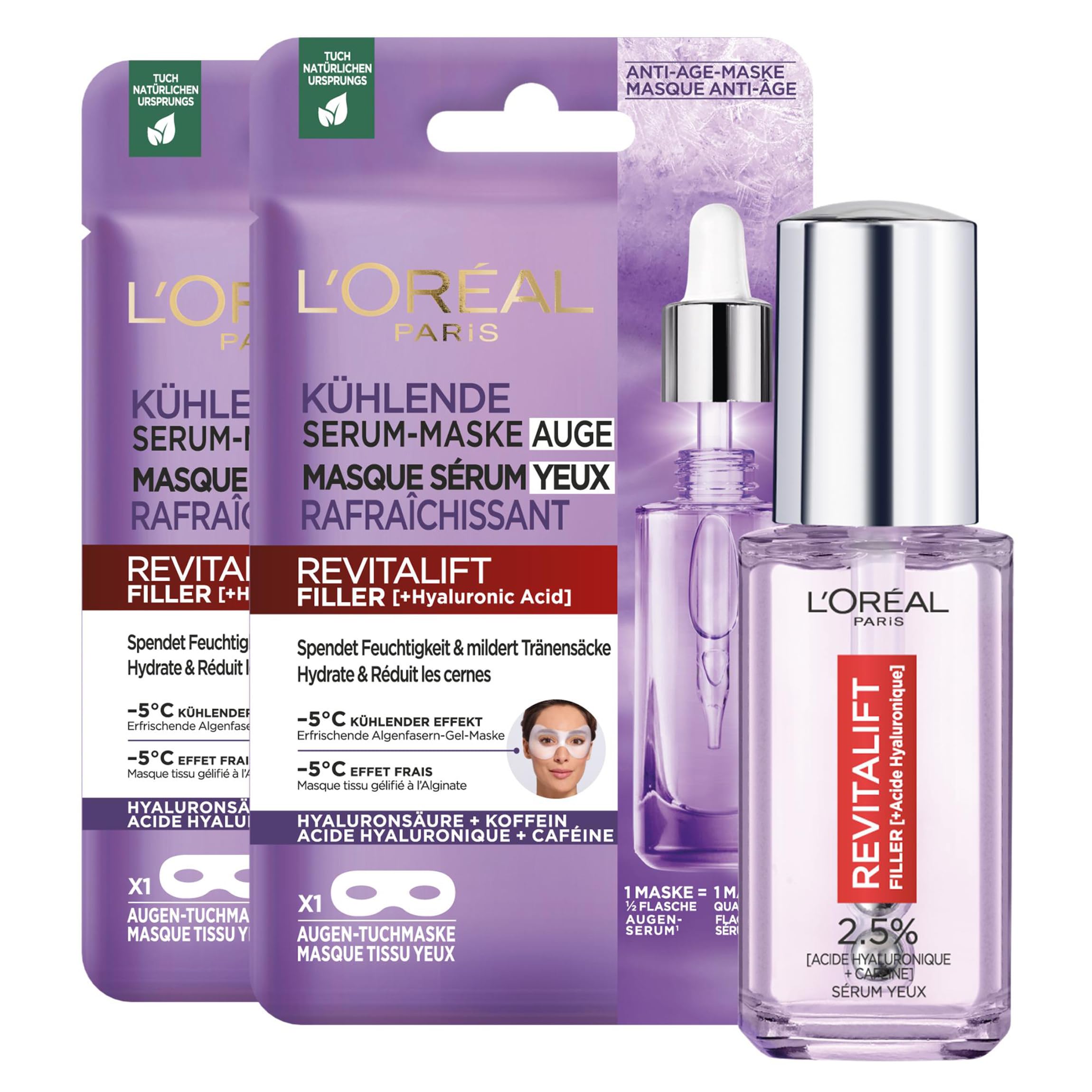 Discover our first specific set for the eyes composed of a Serum and two Sheet Masks. Our highest concentration of Hyaluronic Acid and Caffeine to plump up all wrinkles around the eyes and reduce dark circles. Thanks to its innovative triple-ball roller, the Eye Serum with Hyaluronic Acid and Caffeine massages the entire eye contour, even the eyelid. In addition to providing an instant fresh effect, thanks to its three stainless steel beads which decongest the eye contour, the Serum hydrates the eye contour, smoothes wrinkles and reduces dark circles. Complete with the specific Hyaluronic Acid Eye Sheet Masks for a youthful and fresh look. INGREDIENTS 909261 66 - INGREDIENTS: AQUA WATER • GLYCERIN • HYDROXYETHYLPIPERAZINE ETHANE SULFONIC ACID • NIACINAMIDE • SODIUM HYALURONATE • CAFFEINE • CITRIC ACID • HYDROXYACETOPHENONE • TRISODIUM ETHYLENEDIAMINE DISUCCINATE • ASCORBYL GLUCOSIDE • CAPRYLYL GLYCOL • CHLORPHENESIN (F.I.L. B274592 1). 909292 04 - INGREDIENTS: AQUA WATER • GLYCERIN • PROPANEDIOL • PENTYLENE GLYCOL • SODIUM PHYTATE • CAFFEINE • HYDROXYACETOPHENONE • POTASSIUM HYDROXIDE • SODIUM CITRATE • SODIUM HYALURONATE • TROMETHAMINE • ASCORBYL GLUCOSIDE • PANTHENOL • ACRYLATES C10-30 ALKYL ACRYLATE CROSSPOLYMER • ALCOHOL • CARBOMER (F.I.L. Z281823 1). The lists of ingredients used in the composition of our brand's products are regularly updated. Before using a product from our brand, you are invited to read the list of ingredients on its packaging to ensure that the ingredients are suitable for your personal use.Contents: 1x L'Oréal Paris Revitalift Filler Anti-Wrinkle Eye Care Routine, Includes: 1x Eye Serum (20 ml) 2x Eye Tissue Mask. Formula enriched with Pure Hyaluronic Acid and Pure Caffeine, Serum with innovative triple-ball roller applicator for massaging the entire eye contour, including the eyelid, Alginate tissue mask made from algae fibers. Application: On dry, cleansed skin, leave the mask on for 15 minutes, remove it and gently massage in the excess Apply the serum with circular, upward massages following the instructions on the case. Results: Hydrated skin and a more awake look immediately, Wrinkles around the eyes smoothed and dark circles visibly reduced in 2 weeks, Wrinkles significantly reduced (-21 ) in 6 weeks (Clinical study, 81 women). Skincare routine consisting of an eye serum and two anti-wrinkle, anti-dark circle and anti-puffiness fabric masks for reduced signs of fatigue and plumped wrinkles around the eyes. Suitable for all skin types. Découvrez notre premier coffret spécifique pour les yeux composé d'un Sérum et de deux Masques Tissu. Notre plus haute concentration d'Acide Hyaluronique et de Caféine pour repulper toutes les rides du contour de l'œil et réduire les cernes. Grâce à son roller triple-bille innovant, le Sérum Yeux à l'Acide Hyaluronique et la Caféine masse l'ensemble du contour de l'œil, même la paupière. En plus de procurer un effet frais instantané, grâce à ses trois billes en acier inoxydable qui décongestionnent le contour de l'œil, le Sérum hydrate le contour de l'œil, lisse les rides et réduit les cernes. Complétez avec les Masques Tissu spécifique yeux à l'Acide Hyaluronique pour un regard jeune et frais. INGRÉDIENTS 909261 66 - INGREDIENTS: AQUA WATER • GLYCERIN • HYDROXYETHYLPIPERAZINE ETHANE SULFONIC ACID • NIACINAMIDE • SODIUM HYALURONATE • CAFFEINE • CITRIC ACID • HYDROXYACETOPHENONE • TRISODIUM ETHYLENEDIAMINE DISUCCINATE • ASCORBYL GLUCOSIDE • CAPRYLYL GLYCOL • CHLORPHENESIN (F.I.L. B274592 1). 909292 04 - INGREDIENTS: AQUA WATER • GLYCERIN • PROPANEDIOL • PENTYLENE GLYCOL • SODIUM PHYTATE • CAFFEINE • HYDROXYACETOPHENONE • POTASSIUM HYDROXIDE • SODIUM CITRATE • SODIUM HYALURONATE • TROMETHAMINE • ASCORBYL GLUCOSIDE • PANTHENOL • ACRYLATES C10-30 ALKYL ACRYLATE CROSSPOLYMER • ALCOHOL • CARBOMER (F.I.L. Z281823 1). Les listes d'ingrédients entrant dans la composition des produits de notre marque sont régulièrement mises à jour. Avant d'utiliser un produit de notre marque, vous êtes invités à lire la liste d'ingrédients figurant sur son emballage afin de vous assurer que les ingrédients sont adaptés à votre utilisation personnelleContenu : 1x Routine de soins yeux anti-rides Revitalift Filler de L'Oréal Paris, Inclus : 1x Sérum yeux (20 ml) 2x Masque tissu yeux. Formule enrichie en Acide Hyaluronique Pur et en Caféine Pure, Sérum à l'applicateur roller triple-bille innovant pour un massage de l'ensemble du contour de l'œil même de la paupière, Masque en tissu alginate fabriqué à partir de fibres d'algues. Application : Sur peau sèche et nettoyée, laisser poser le masque 15 minutes, le retirer et masser en douceur pour faire pénétrer l'excèdent Appliquer le sérum par massages circulaires et ascendants en suivant les instructions sur l'étui. Résultats : Peau hydratée et regard plus éveillé immédiatement, Rides du contour de l'œil lissées et cernes visiblement réduits en 2 semaines, Rides considérablement réduites (-21 ) en 6 semaines (Etude clinique, 81 femmes). Routine de soins composée d'un sérum pour les yeux et de deux masques en tissu anti-rides, anti-cernes et anti-poches pour des signes de fatigue réduits et des rides repulpées sur le contour de l'œil, Convient à tous les types de peaux.